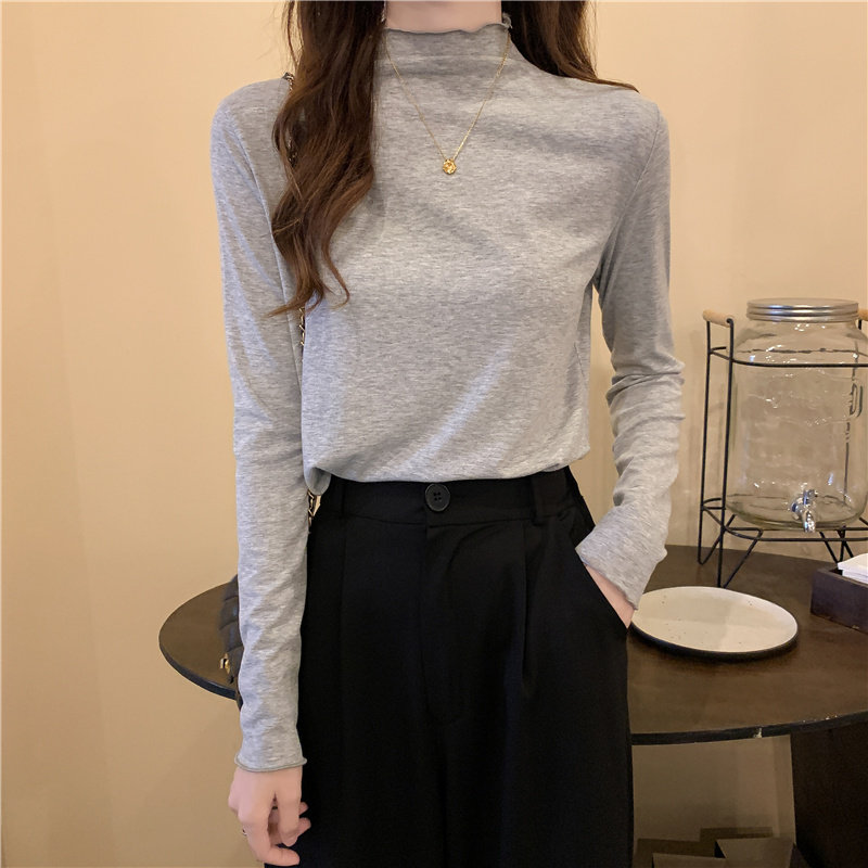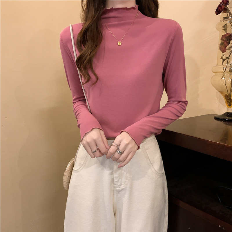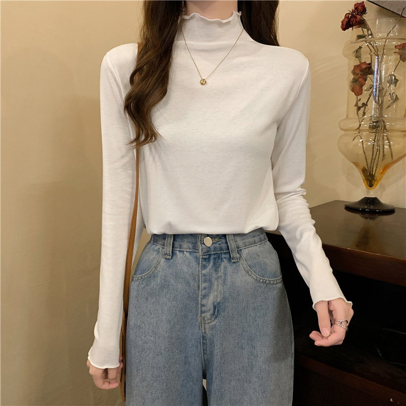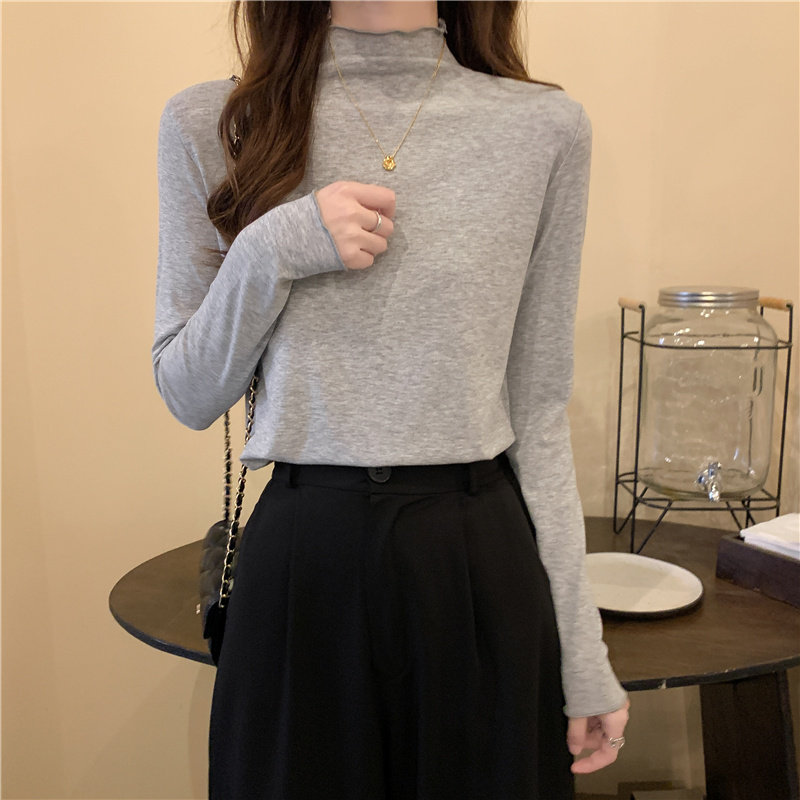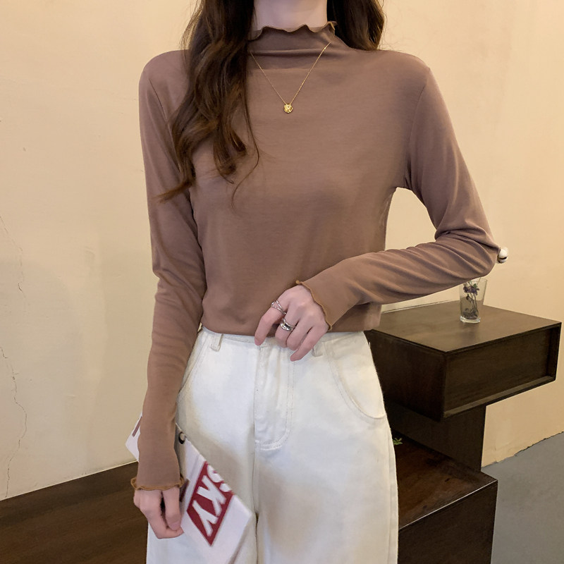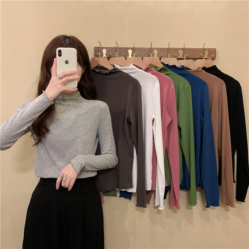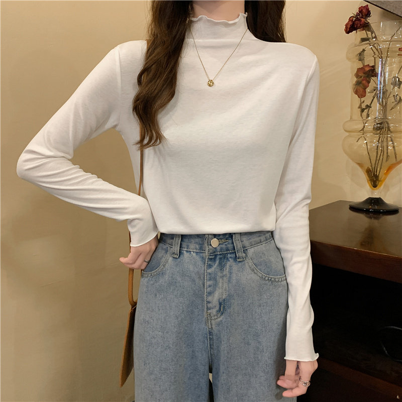 Осенняя тонкая футболка, демисезонный базовый приятный телу лонгслив, высокий воротник, в западном стиле, облегающий крой