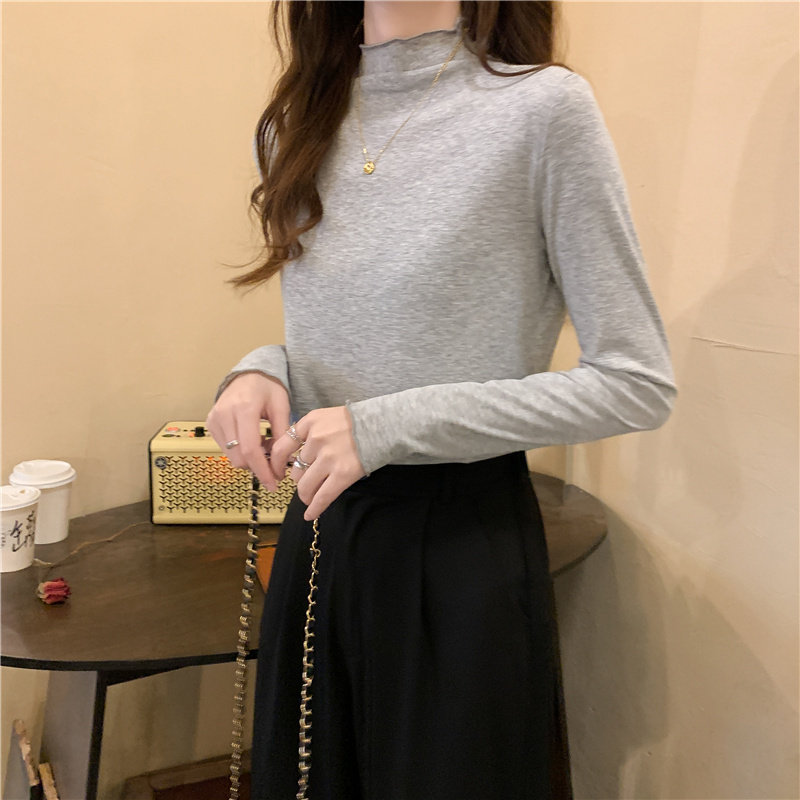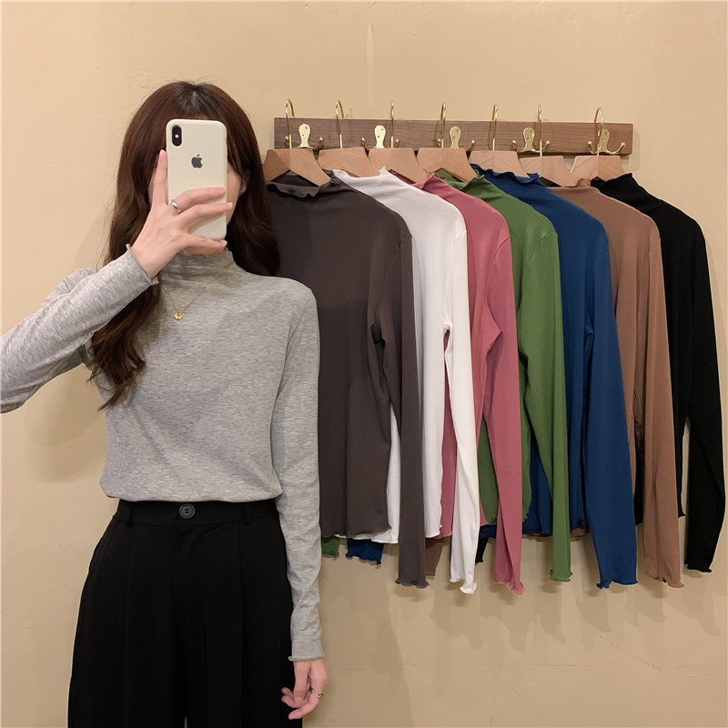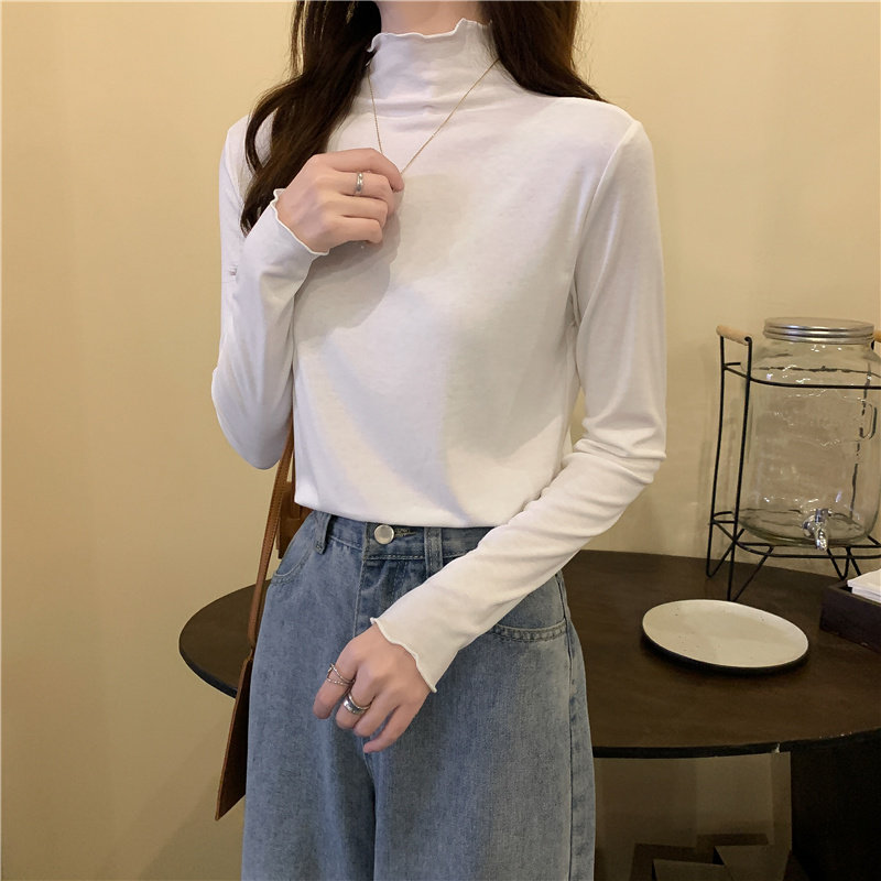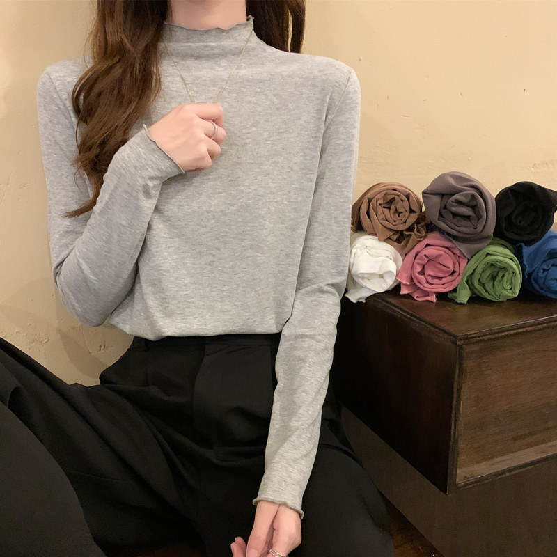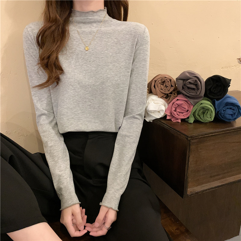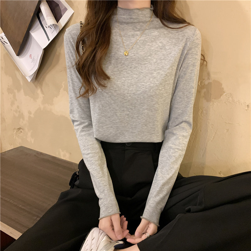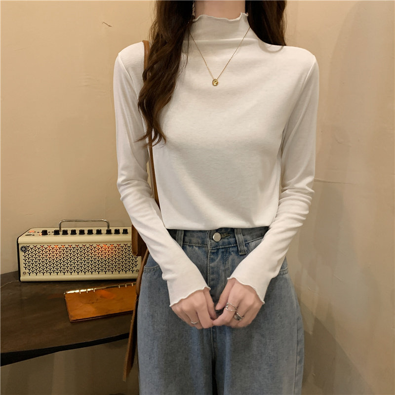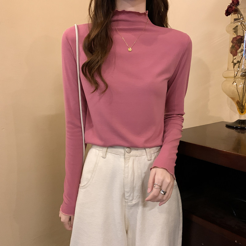 Осенняя тонкая футболка, демисезонный базовый приятный телу лонгслив, высокий воротник, в западном стиле, облегающий крой