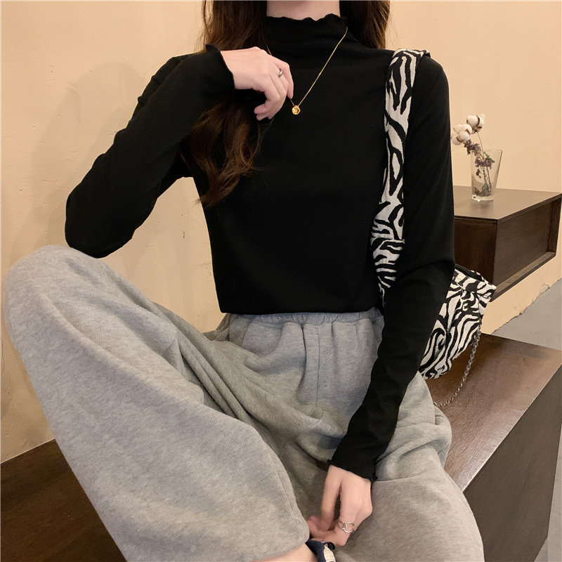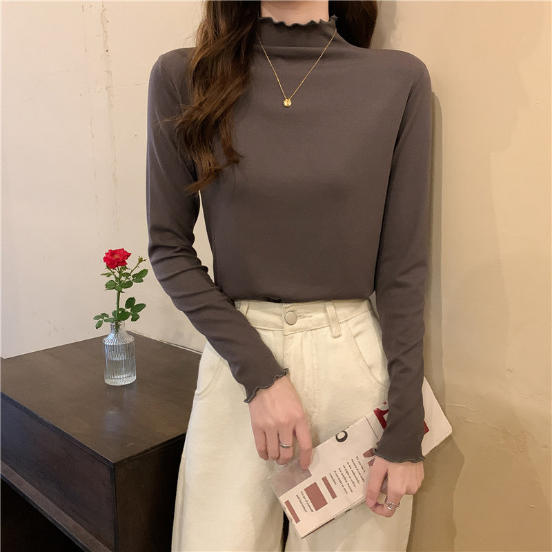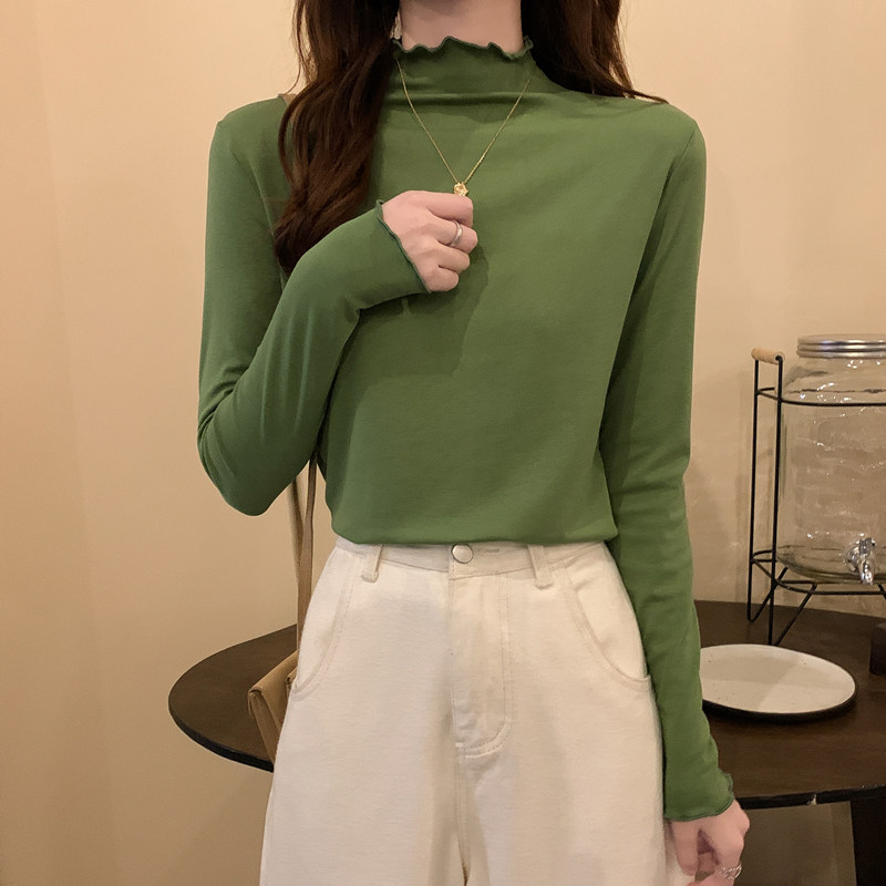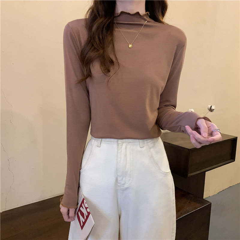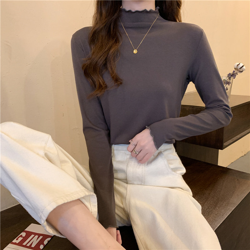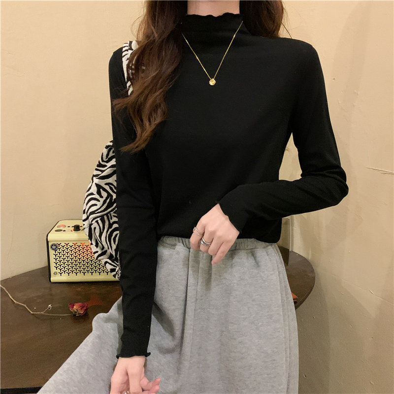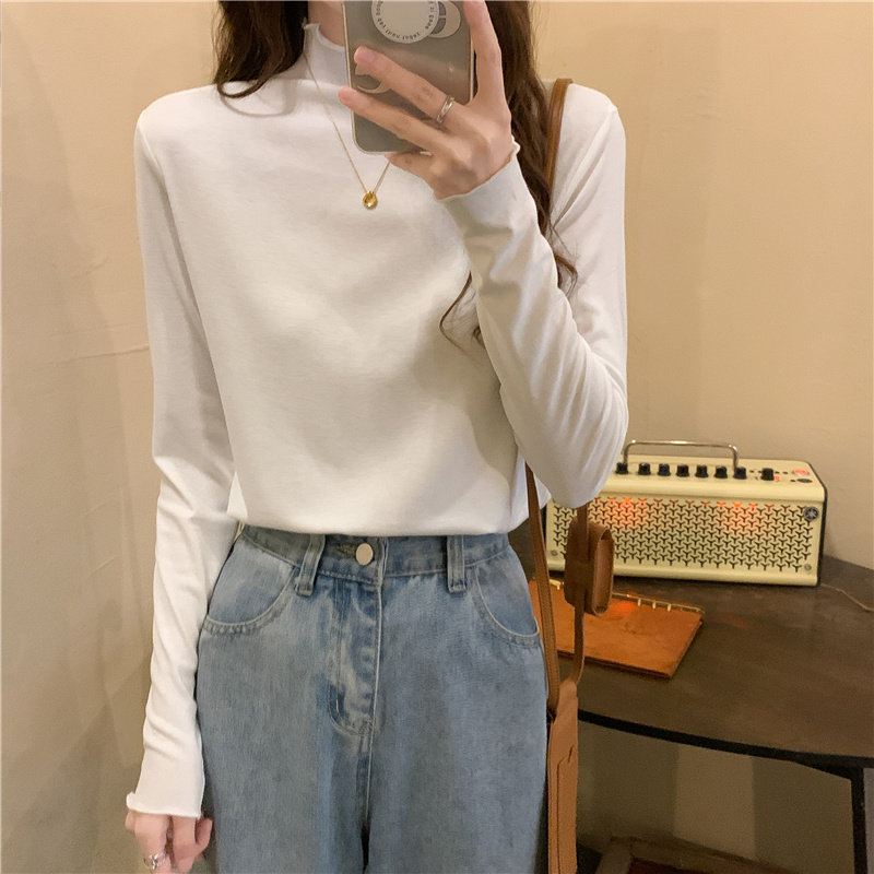 Осенняя тонкая футболка, демисезонный базовый приятный телу лонгслив, высокий воротник, в западном стиле, облегающий крой
