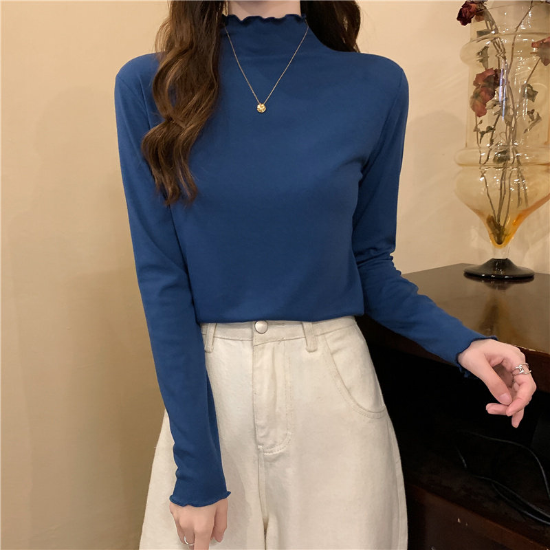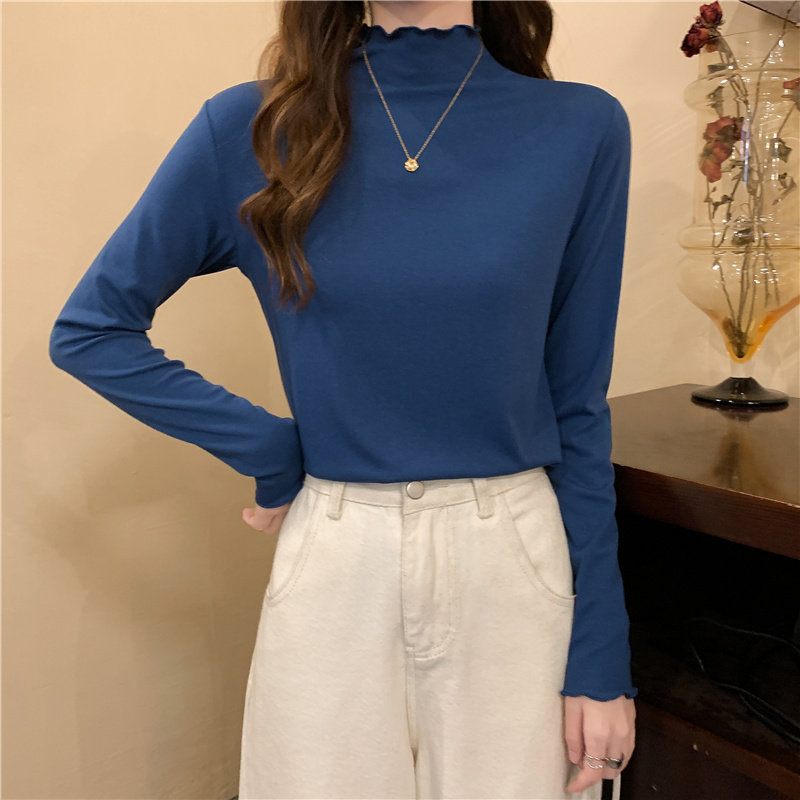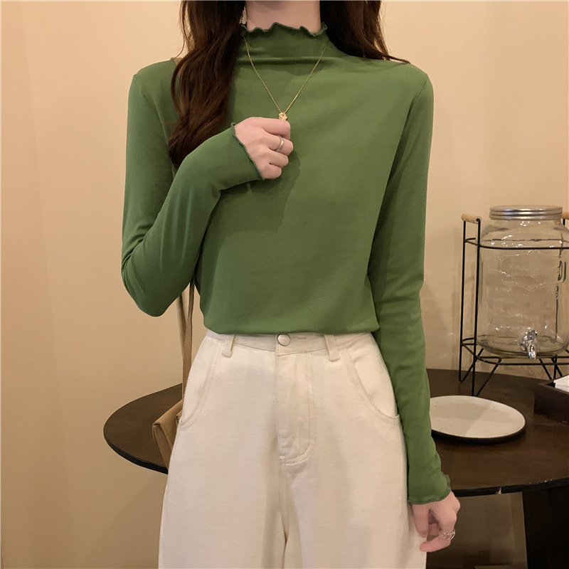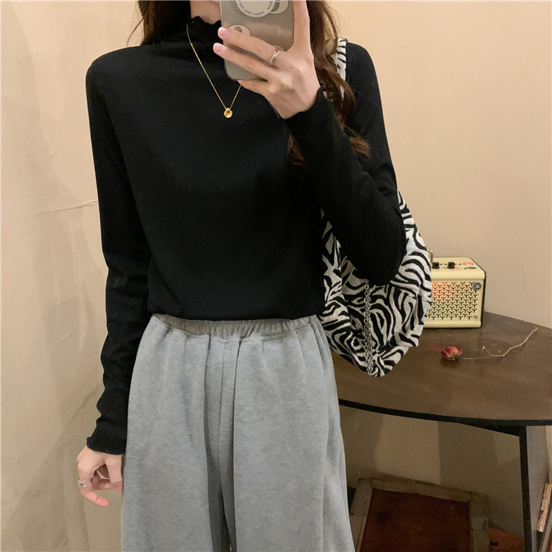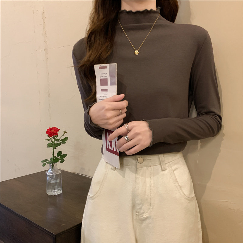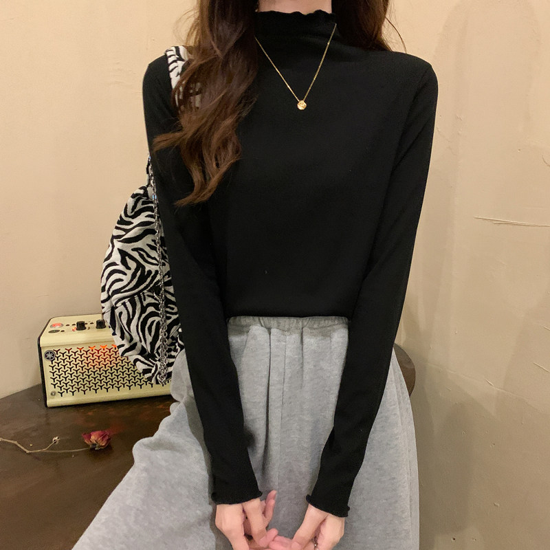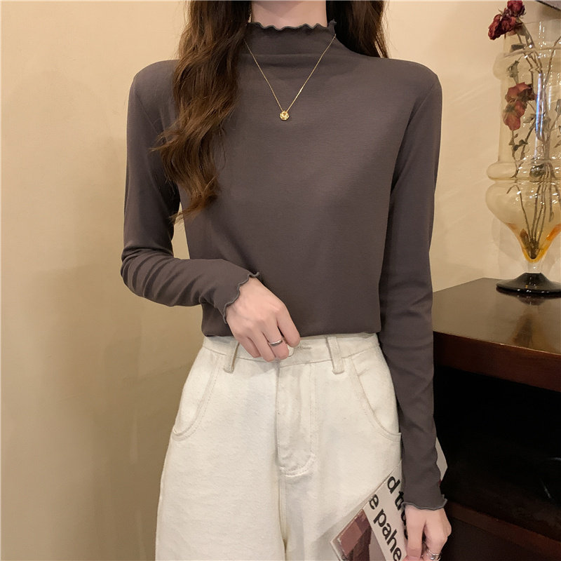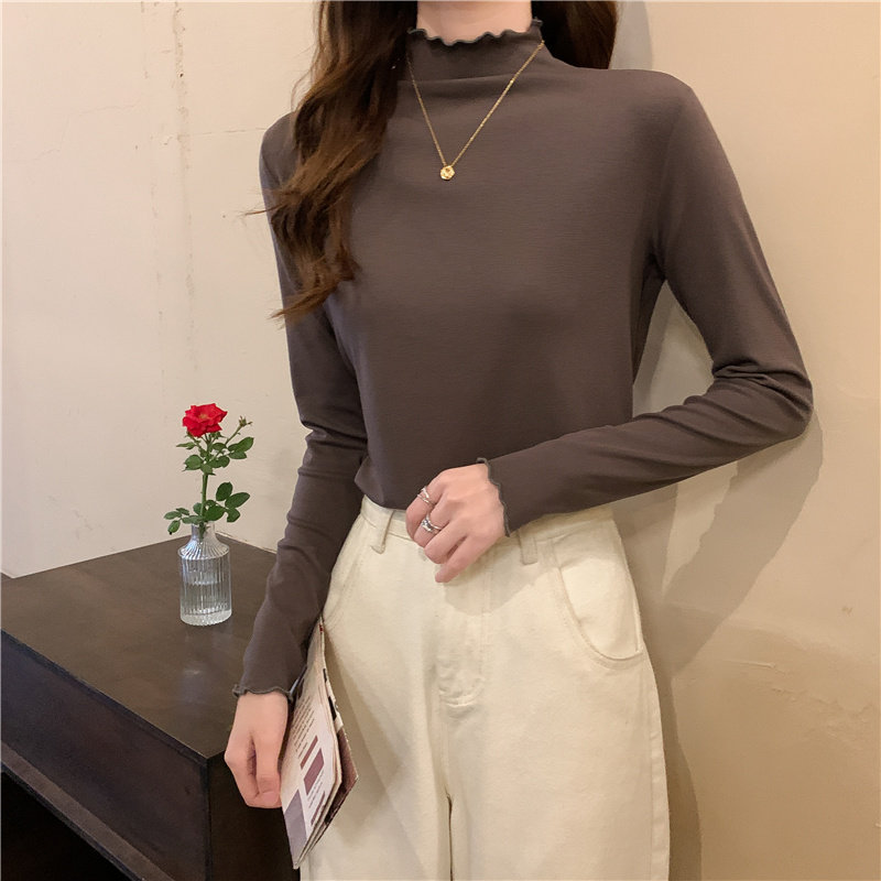 Осенняя тонкая футболка, демисезонный базовый приятный телу лонгслив, высокий воротник, в западном стиле, облегающий крой