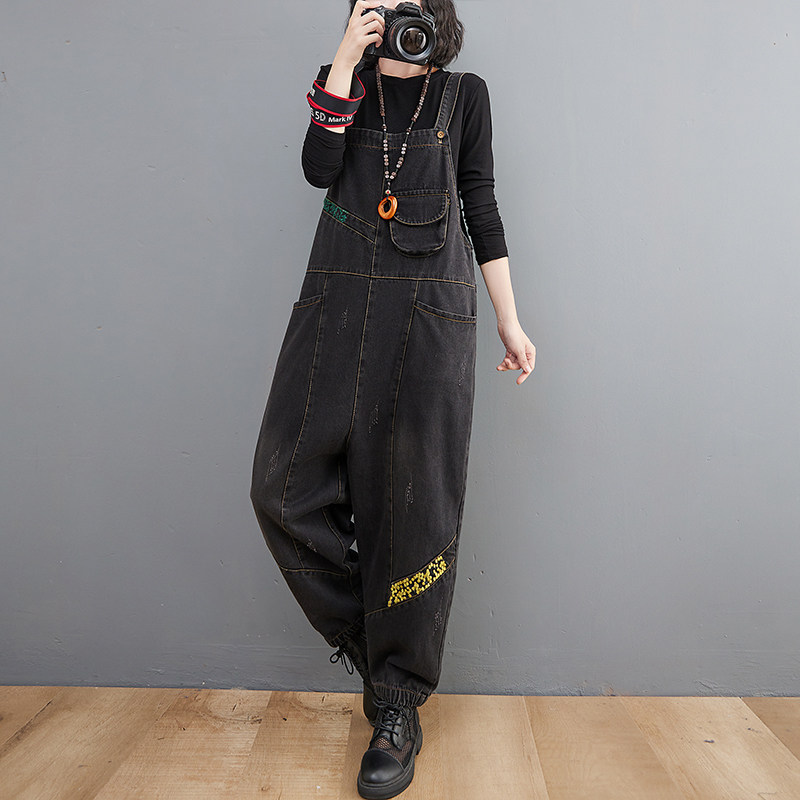 Джинсовый осенний комбинезон, универсальные ретро штаны, большой размер, свободный крой, по фигуре, с вышивкой