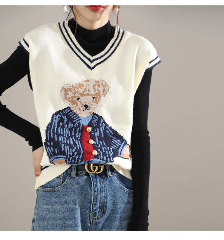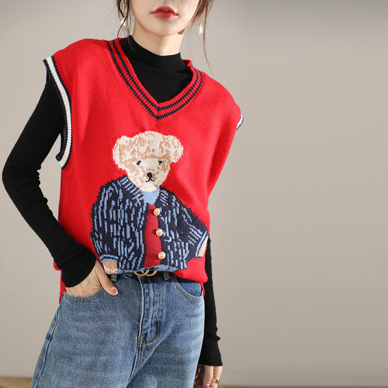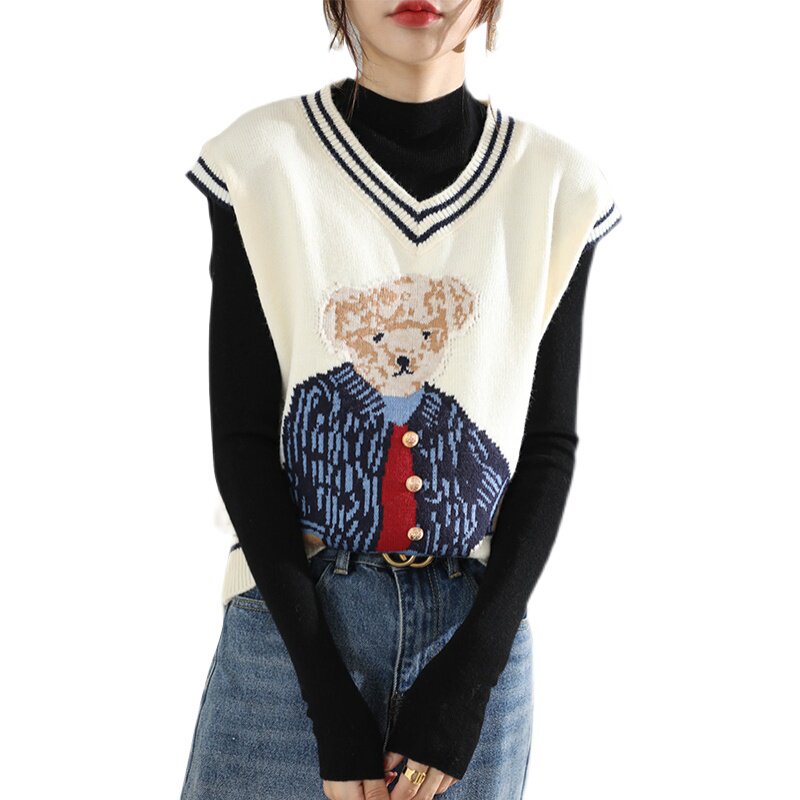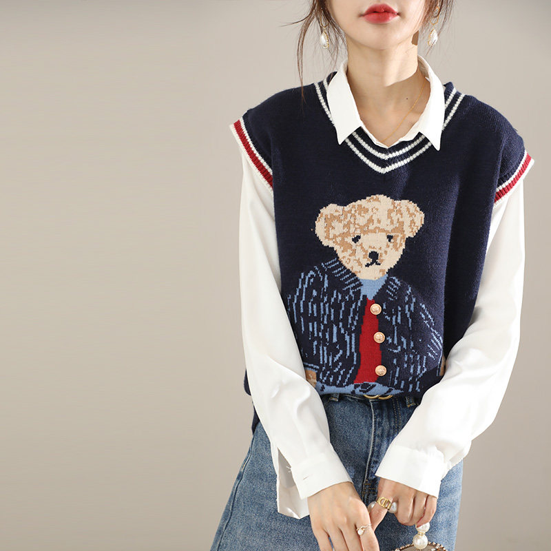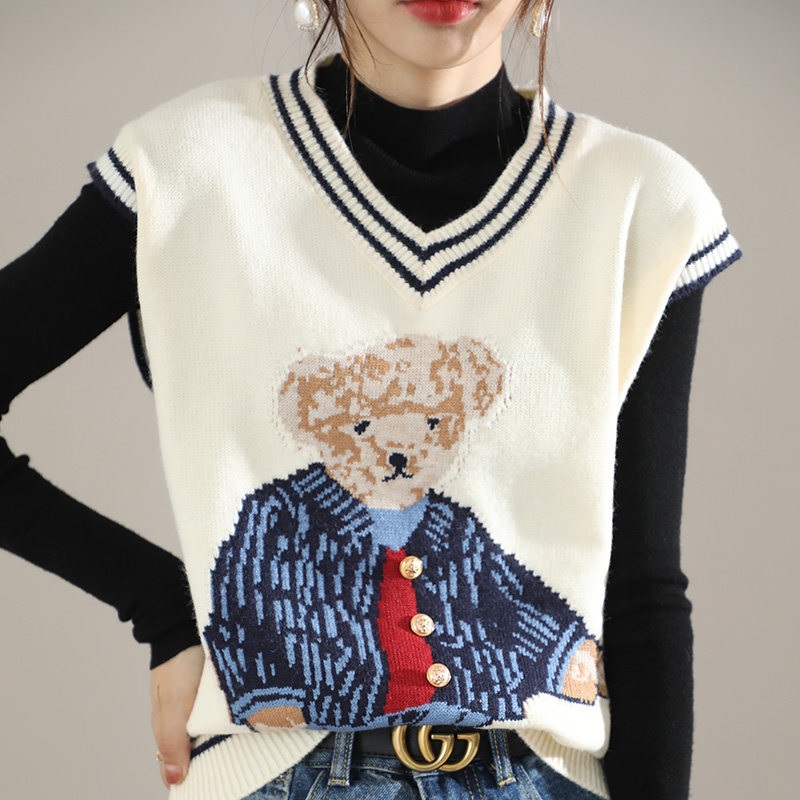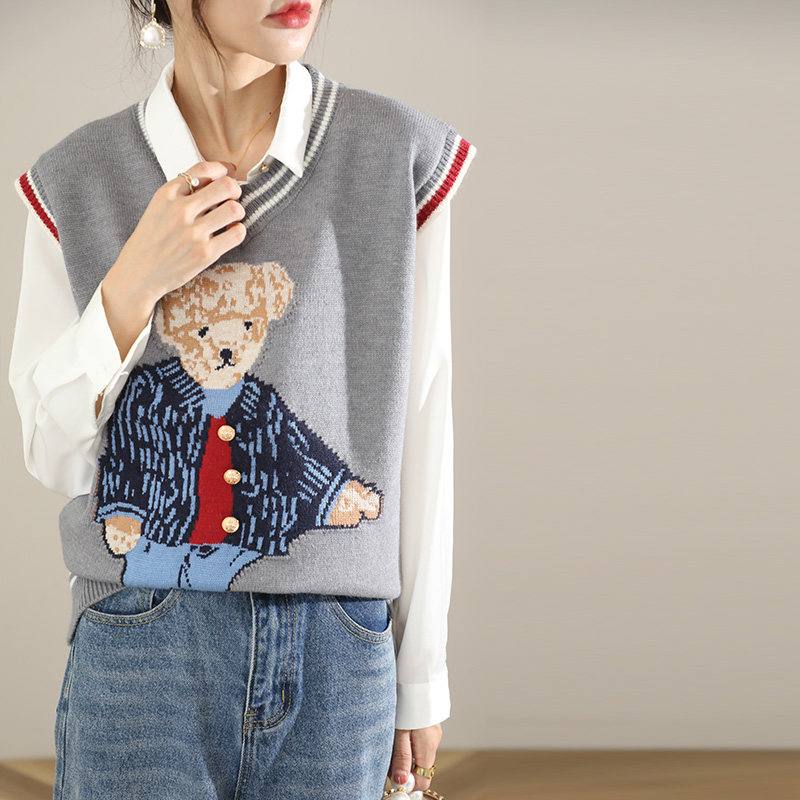 Свитер, демисезонный трикотажный жилет без рукавов, с медвежатами, в корейском стиле, с вышивкой