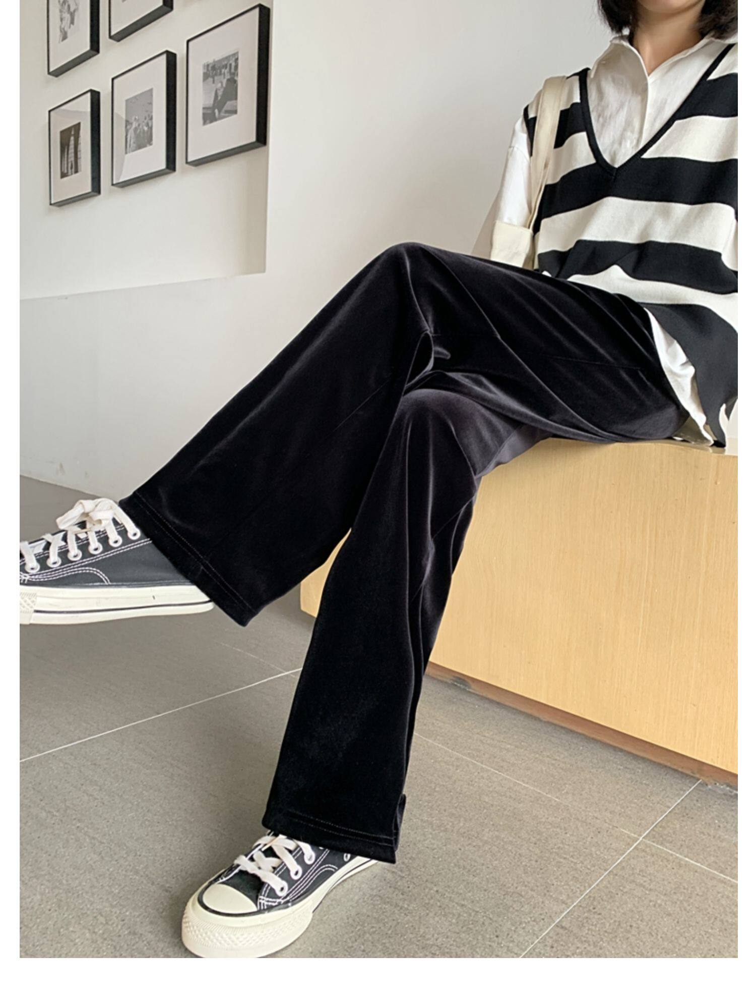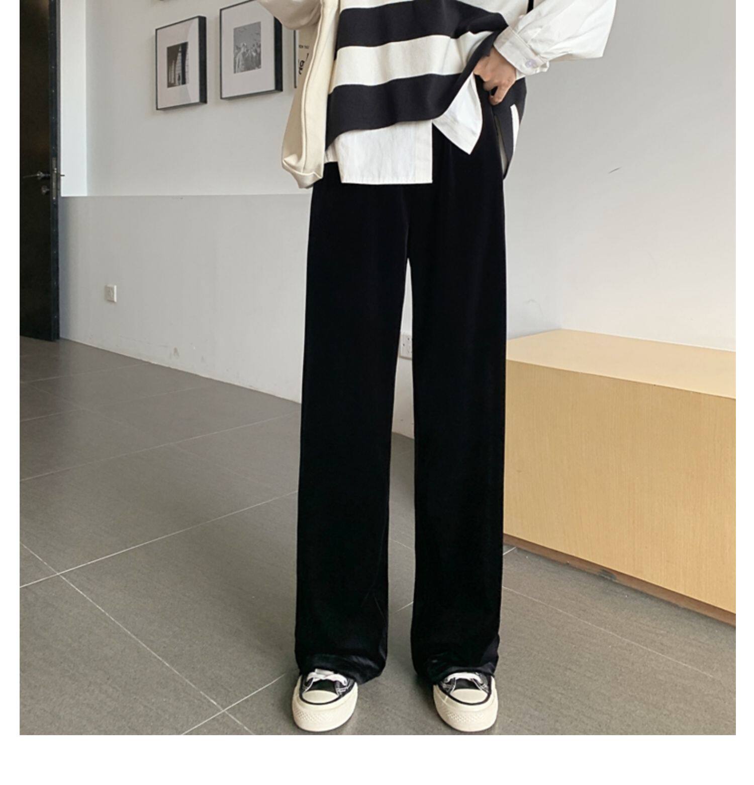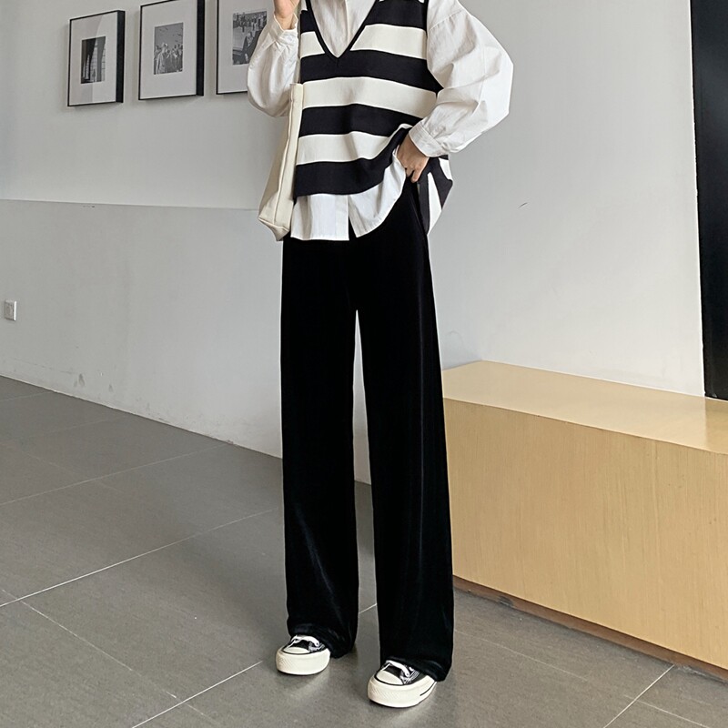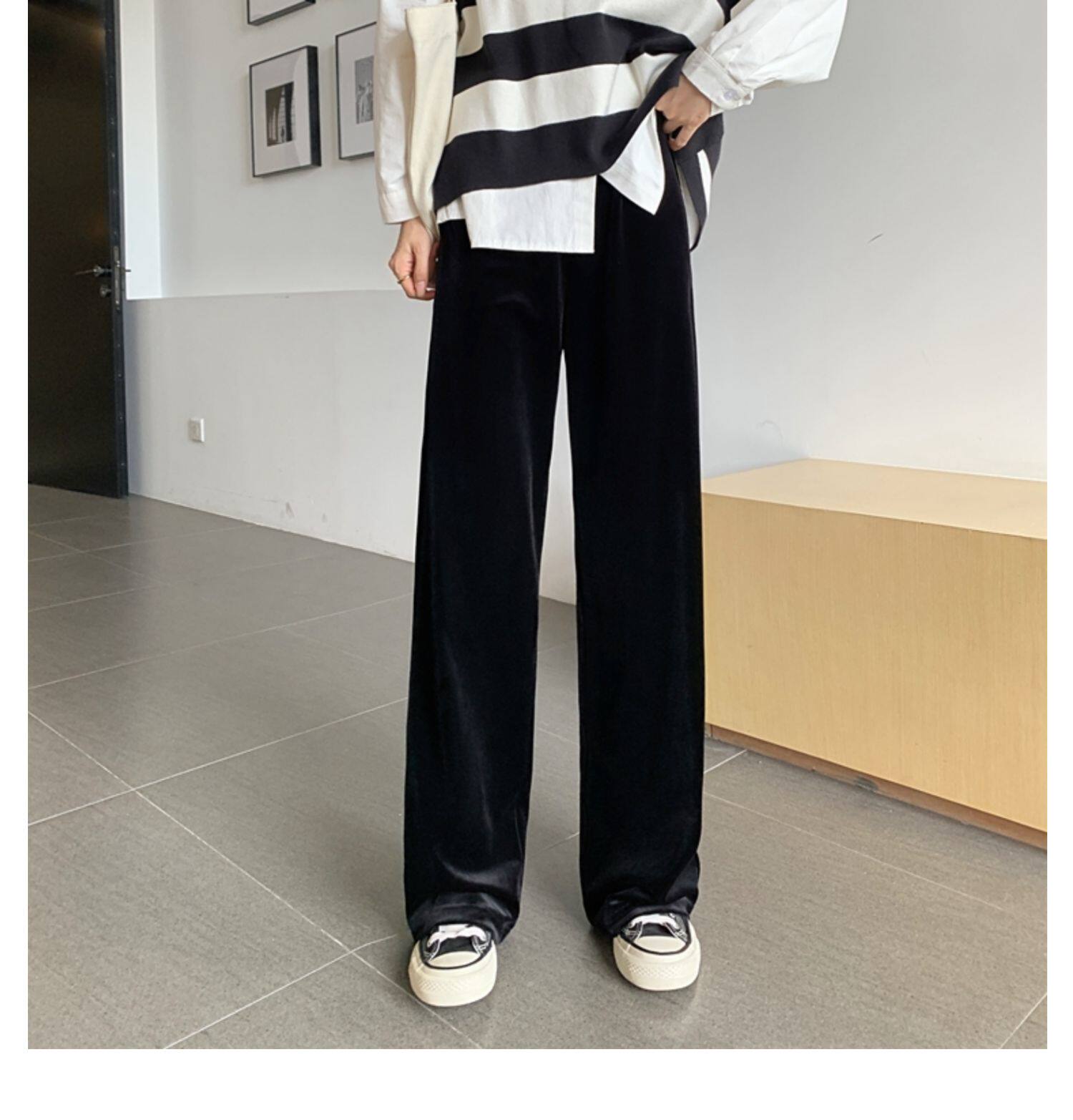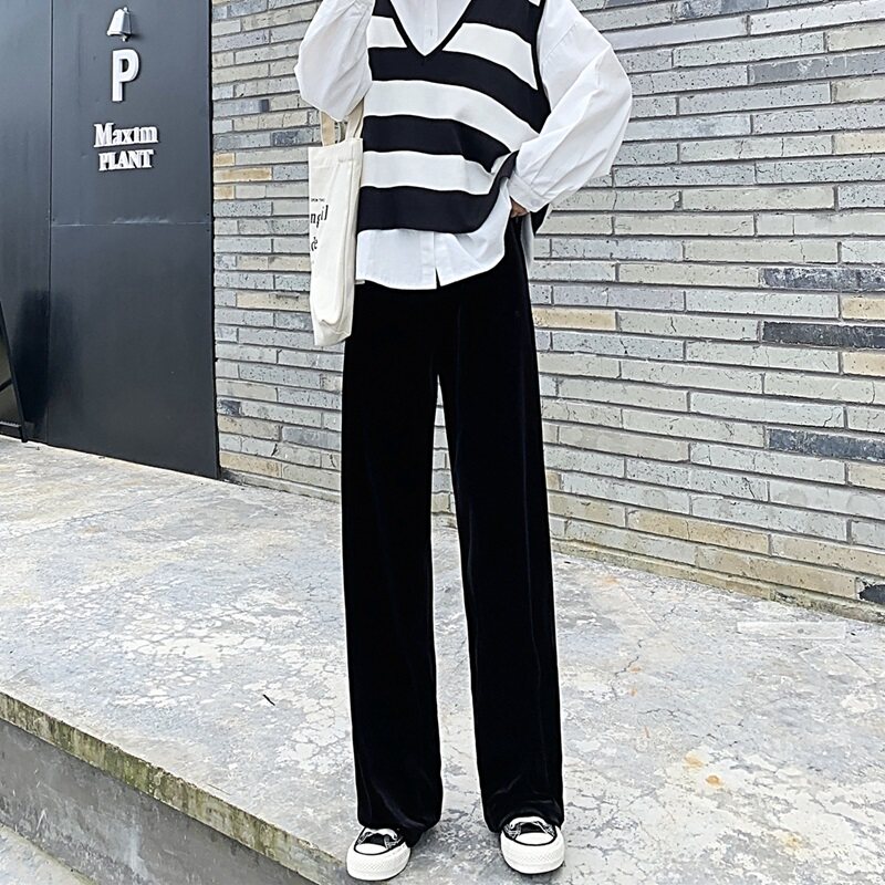 Осенние бархатные черные штаны, коллекция 2021, высокая талия, свободный прямой крой