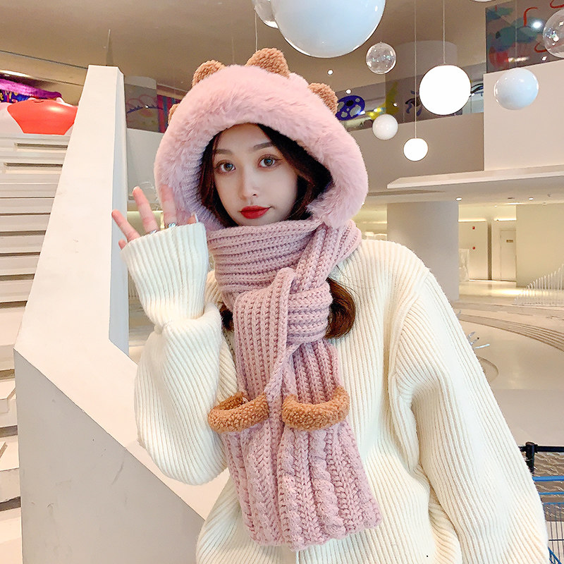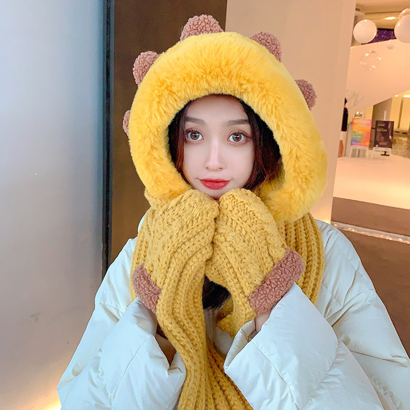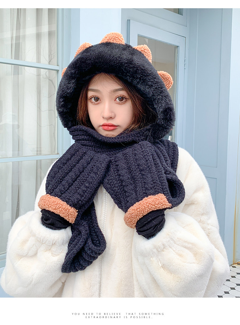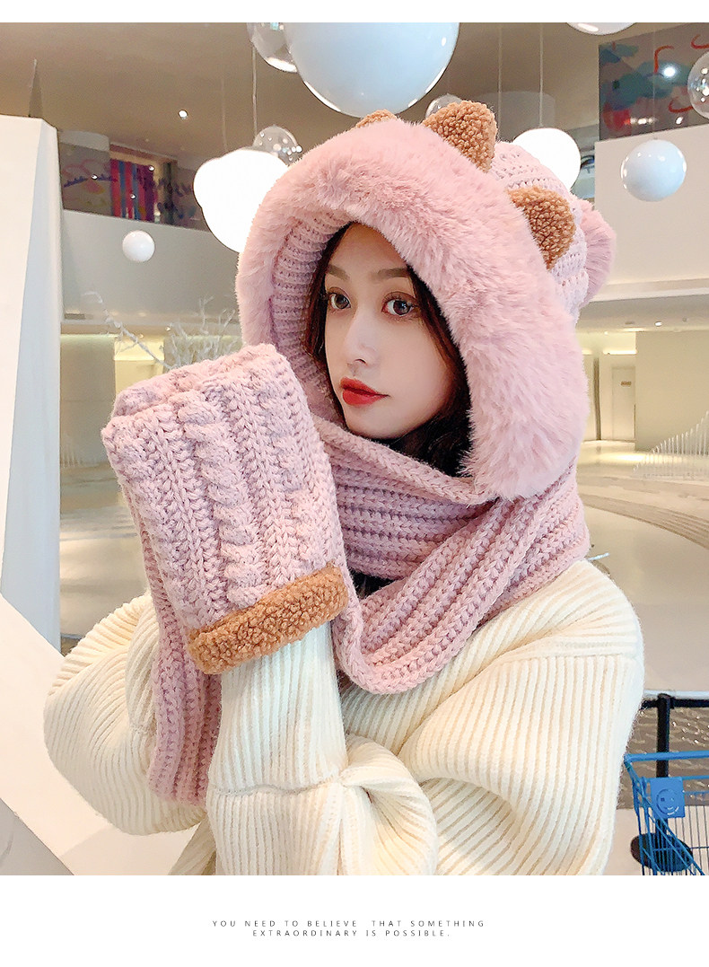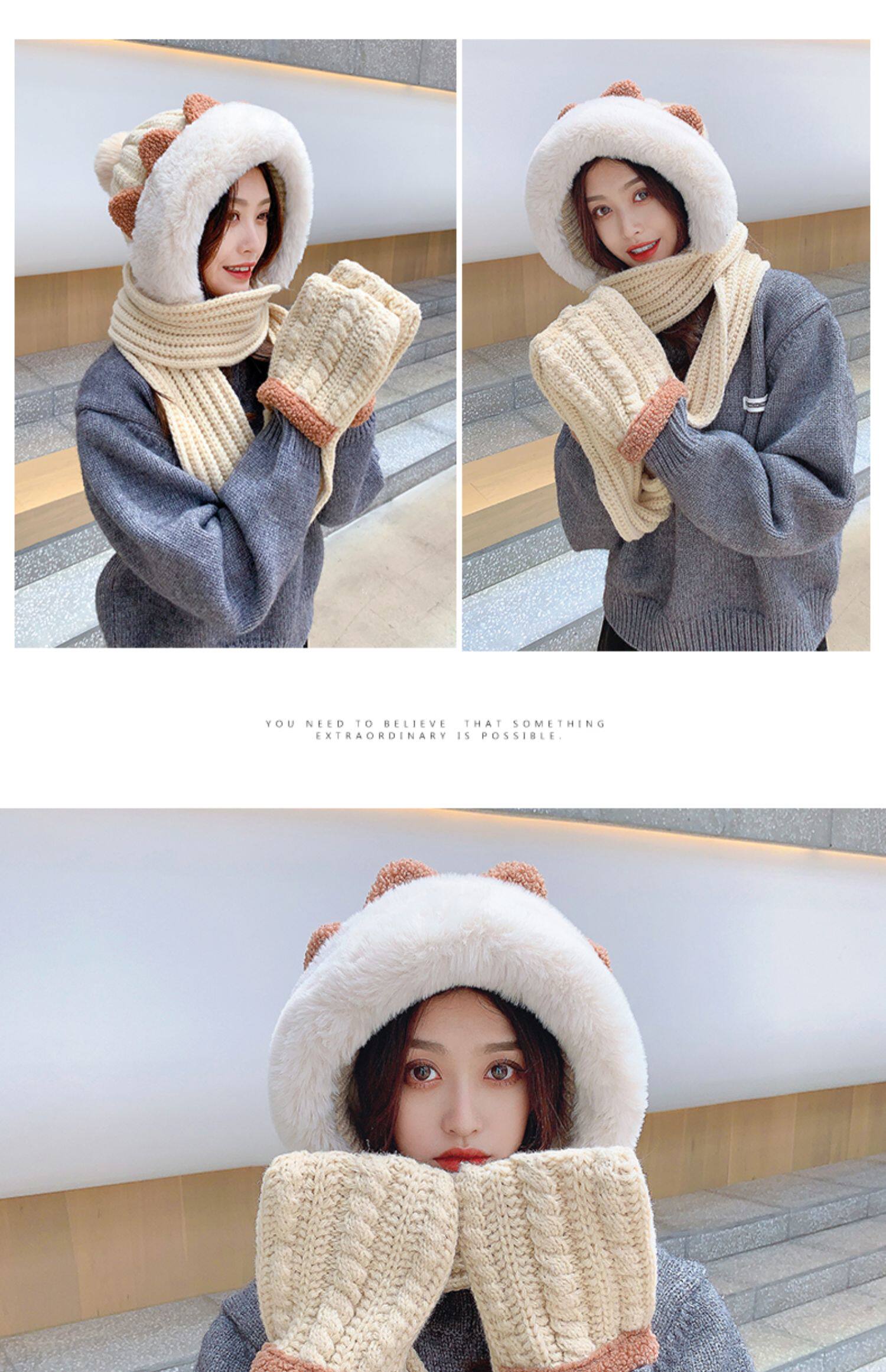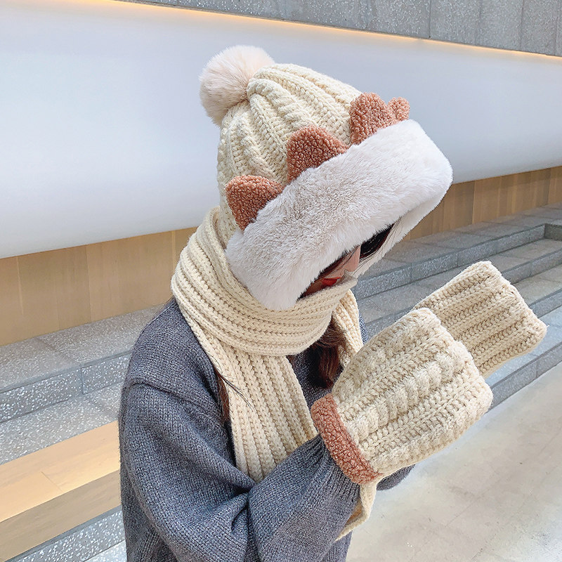 Демисезонная милая шапка, шарф, бархатные перчатки, удерживающий тепло шерстяной комплект, увеличенная толщина, 3 предмета
