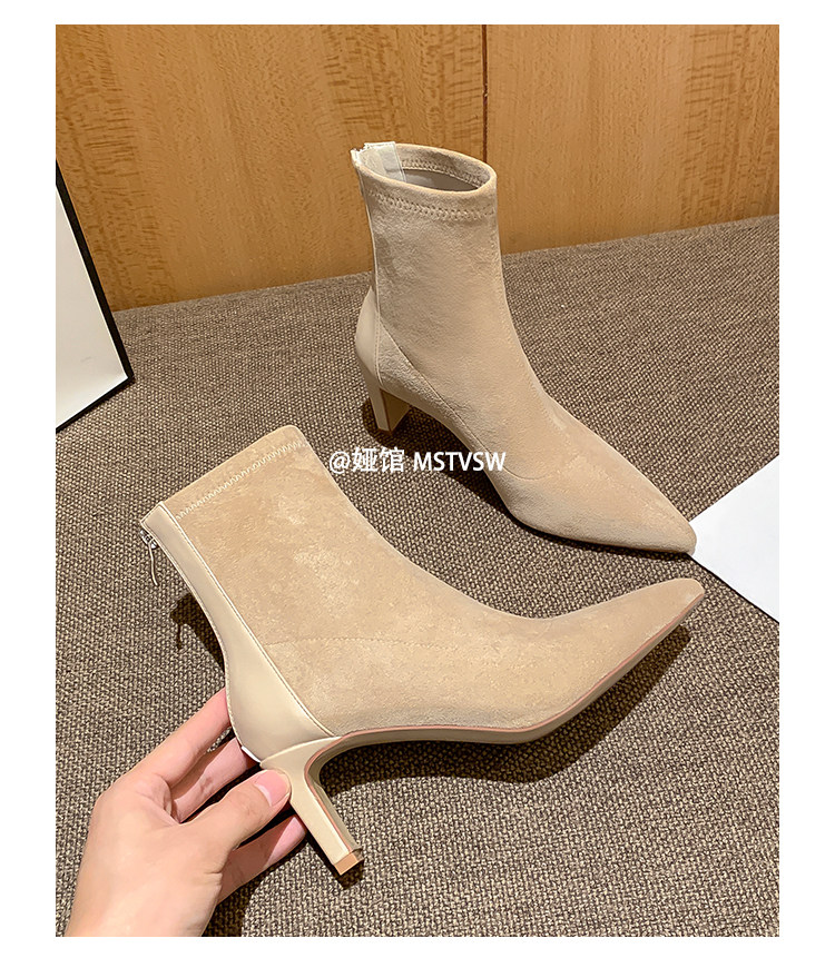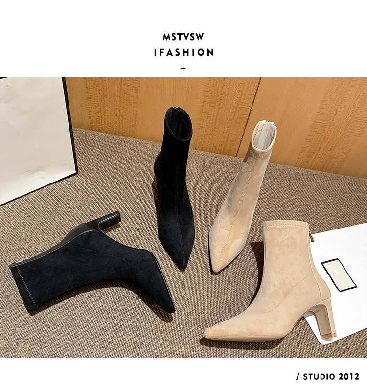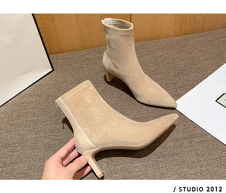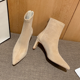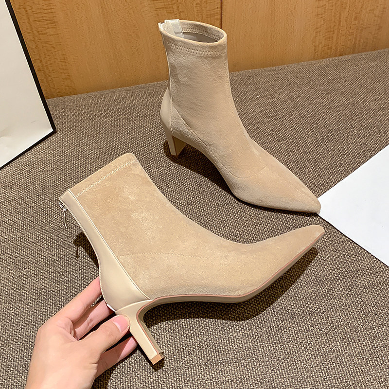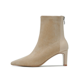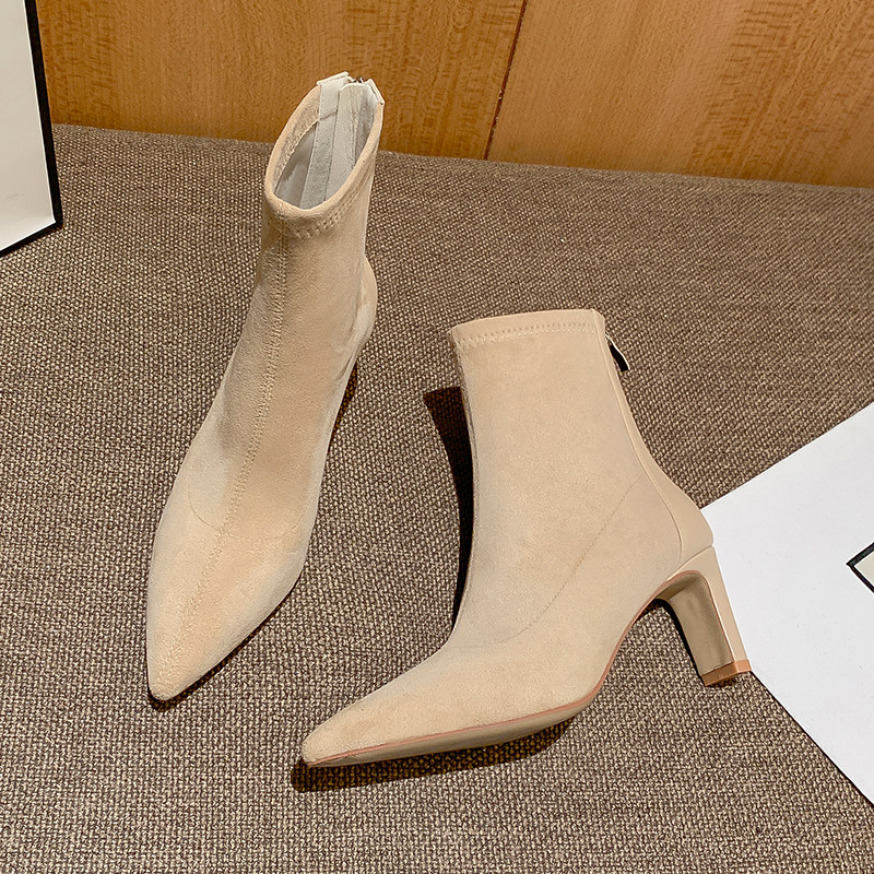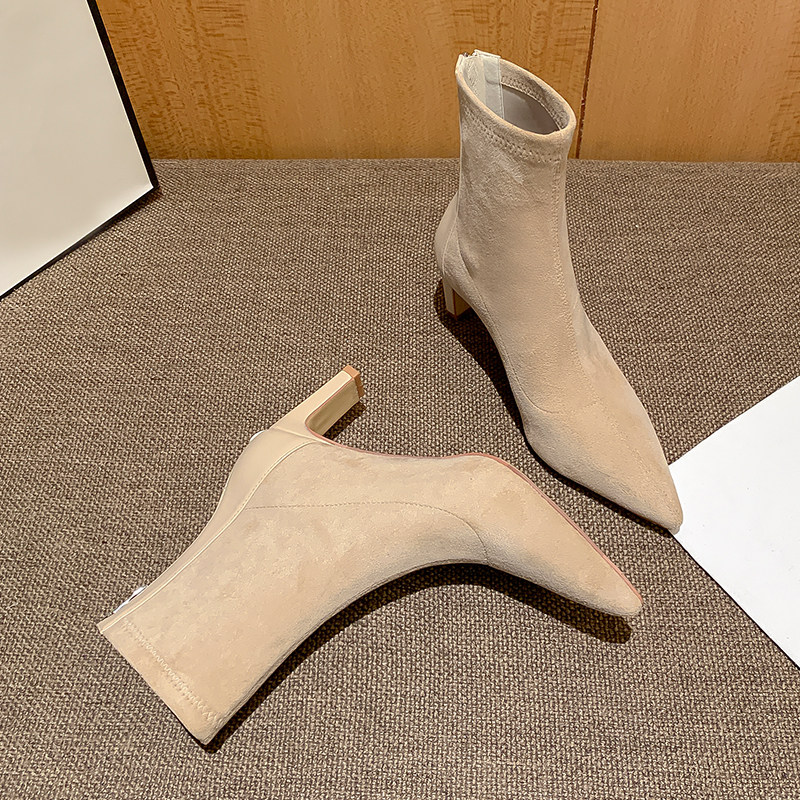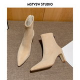 Высокие замшевые эластичные демисезонные ботинки с заостренным носом, нюдовые короткие сапоги, ботильоны, французский стиль
