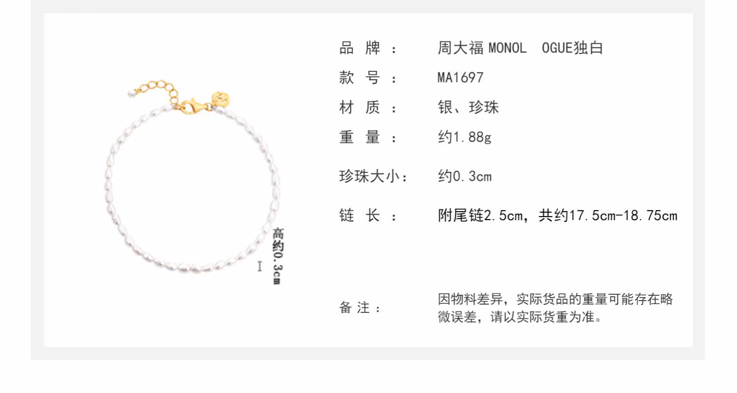 Chow Tai Fook Monology Monopo White Small Fresh and Simple Bearl Silver Bracelet MA1697