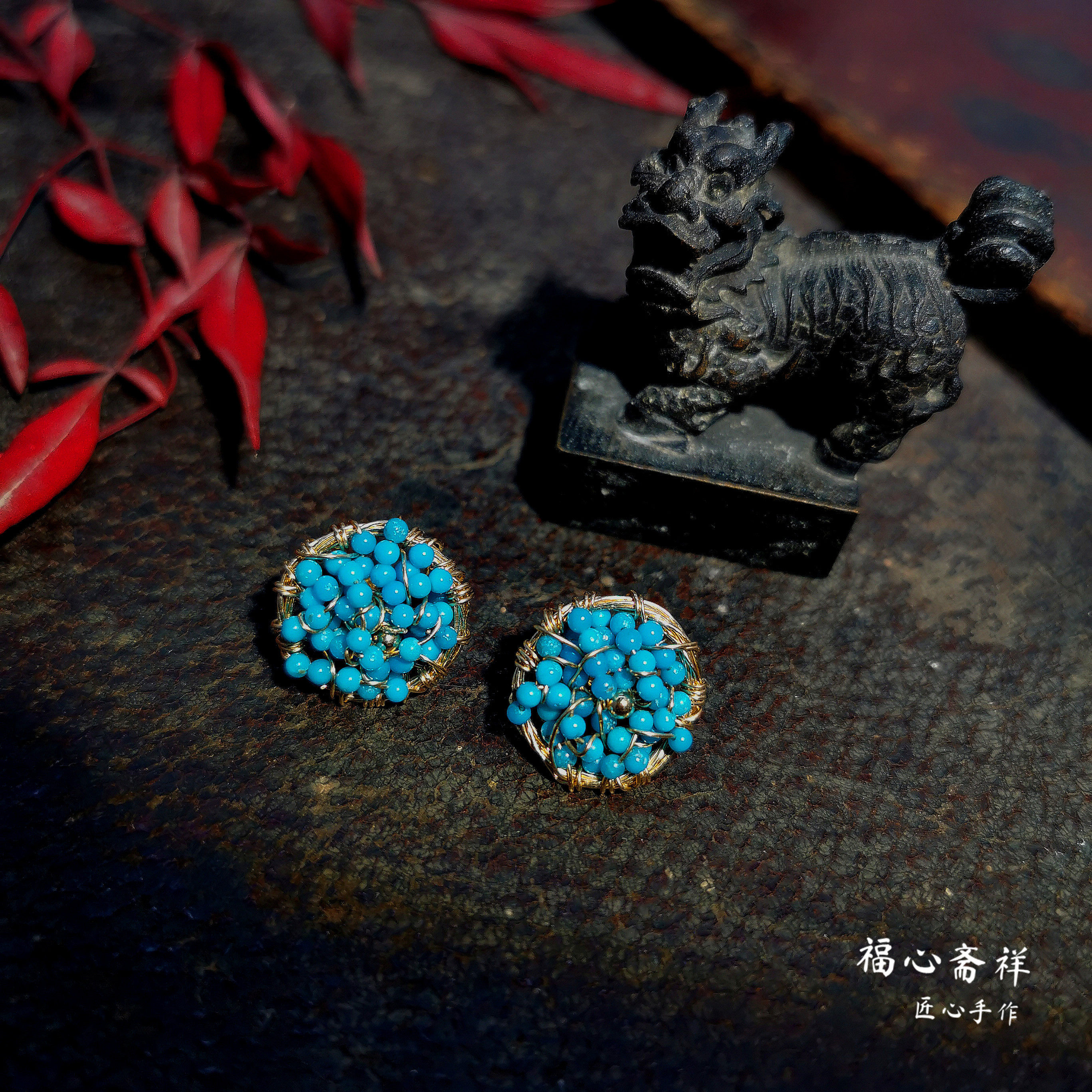 Натуральная бирюзовая природная руда, оригинальные серьги, дизайнерское украшение-шарик, бусины, золото 14 карат