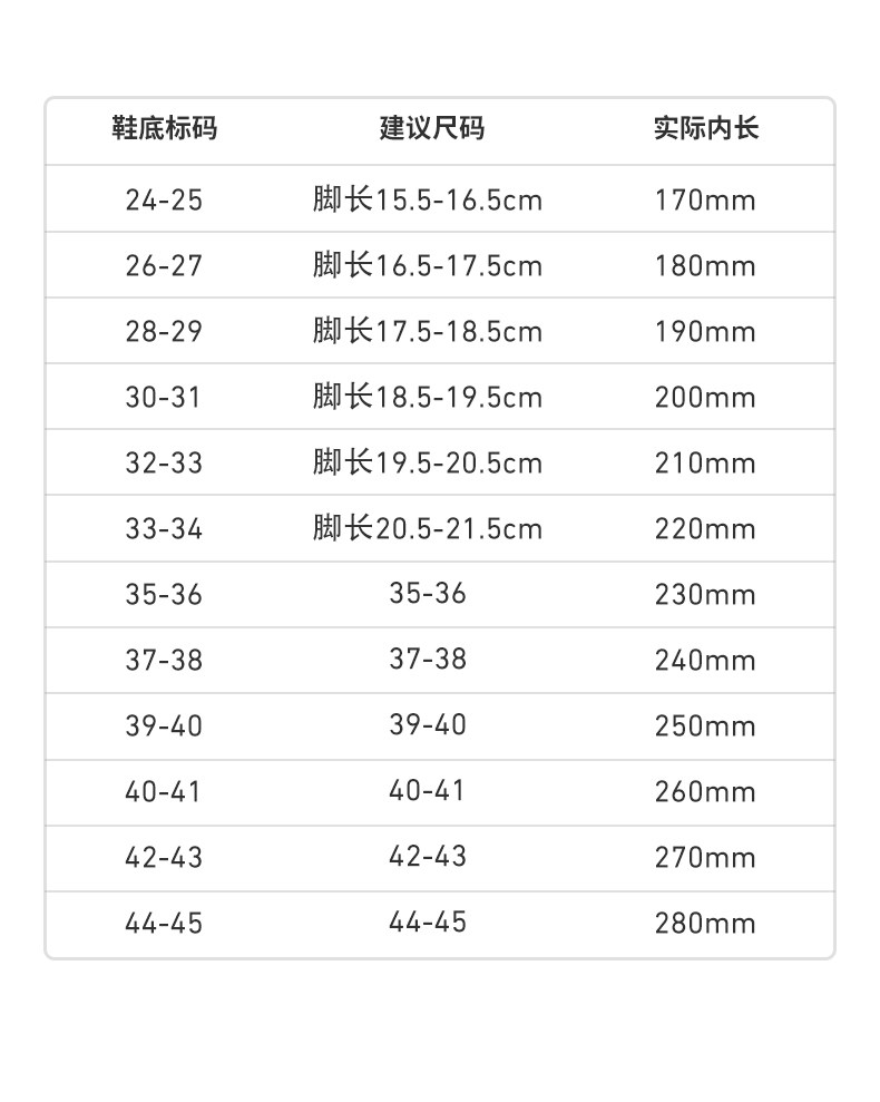 | Размер обуви: | 170 (рекомендуемая длина стопы 15,5-16,5 см), 180 (рекомендуемая длина стопы 16,5-17,5 см), 190 (рекомендуемая длина стопы 17,5-18,5 см), 200 (рекомендуемая длина стопы 18,5-19,5 см), 210 (рекомендуемая длина стопы 20,5-21,5 см), 220 (рекомендуемая длина стопы 21,5-22,5 см), 35-36 (предложение 35-36), 37-38 (предложение 37-38), 39-40 (предложение 39-40), 40-41 (предложение 40-41), 42-43 (предложение 42-43), 44-45 (предложение 44-45), 46-47 (предложение 46-47) |