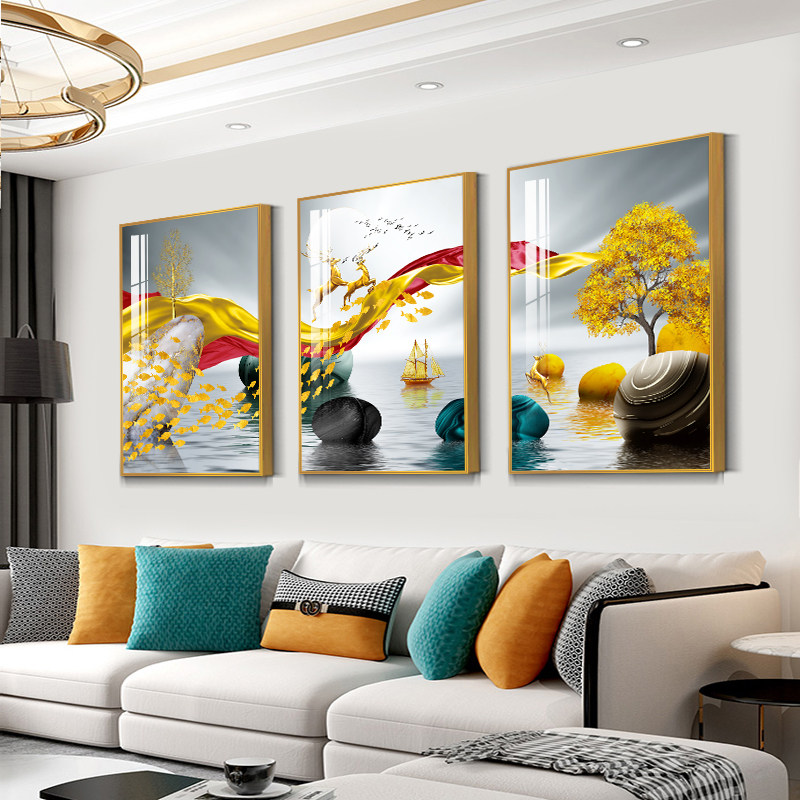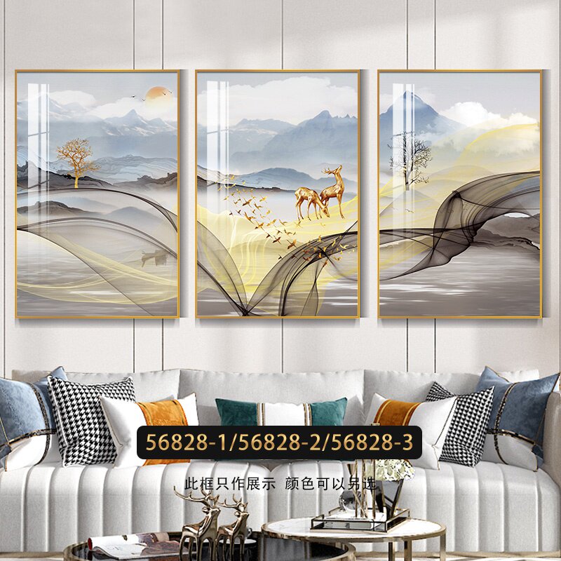 Гостиная в европейском стиле ТВ D ТВ шкаф фон украшение стены живопись золотой пейзаж атмосферный современный диван висит картина пейзаж триптих