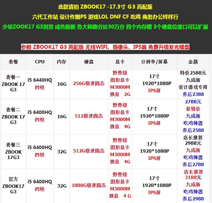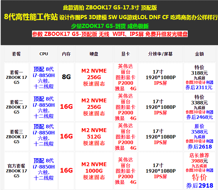 Пакет а ZBOOK 17 G5 | Вершина Восемь поколений i7-8850H шестьядерный. Двенадцать нитей | 8G | M2 NVME 256G Скорость твердое | Нвидия Литаи Графическая графическая карта P2000 Независимый 4G | 17 дюймов 1920*1080P Экран IPS | Специальное предложение 3188 Юань 90 % новый Рисунок 3D дизайнОружие 2311 юаней после купона | ||