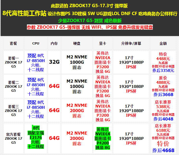 Пожалуйста, сфотографируйте эту модель ZBOOK17 G5-17,3-дюймовая мощная версия. 8 -я генерация высокая рабочая станцияДизайн рисунок PS 3D Modeling SW UG Game LOL DNF CF EATE CHICK Небольшое количество Zook17 G5- Параметры ZBOOK17 G5-Powerful Edition Wireless WIFI,Экран IPSБесплатно обновить светящуюся клавиатуру