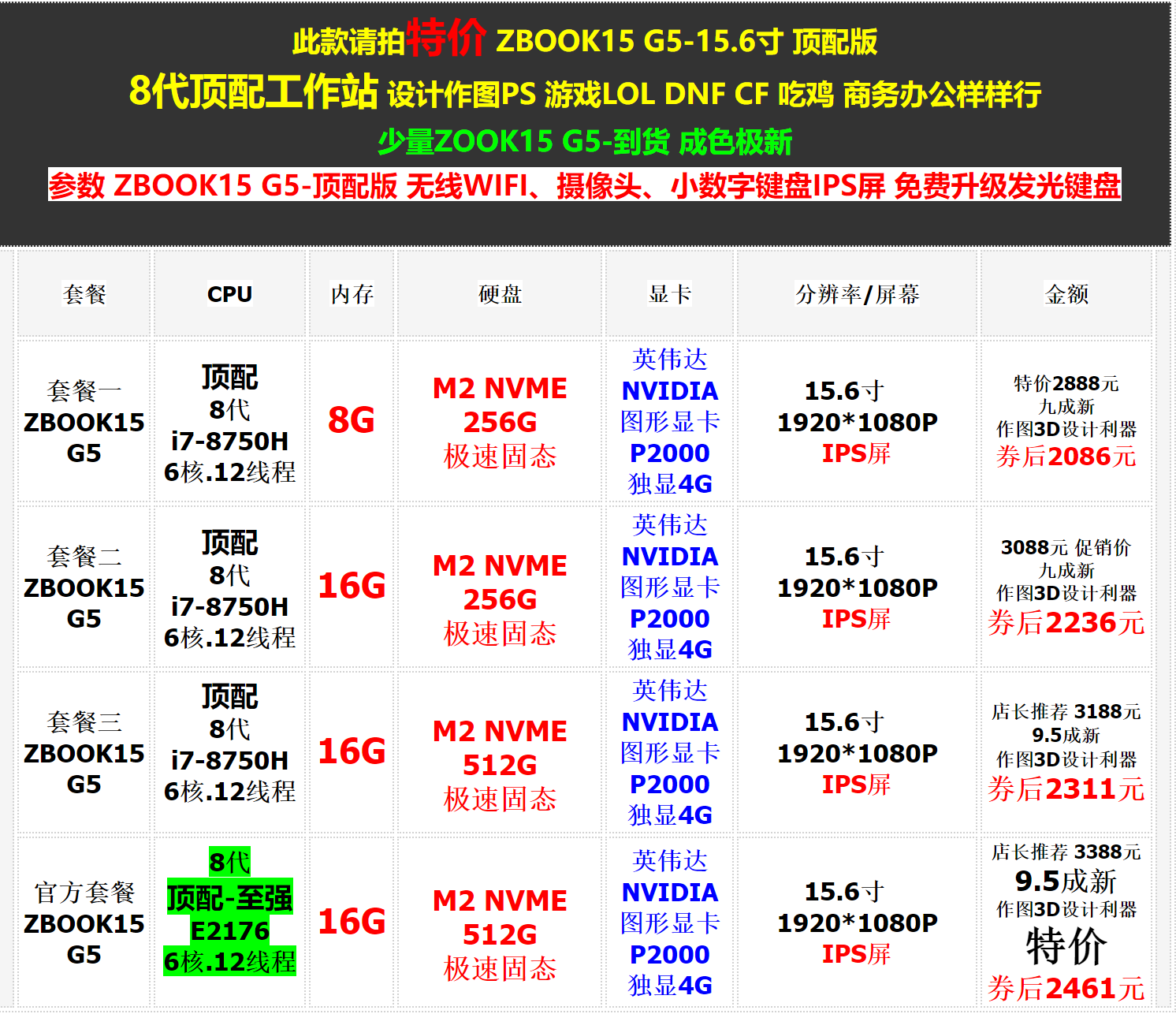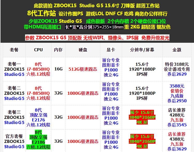 Пожалуйста, стреляйте в этоСпециальное предложениеZBook15 G5-15,6 дюймаВерсия 8 -я генерация главная рабочая станцияDesign PS Game LOL DNF CF ET CHICH Небольшое количество Zook15 G5- Параметр ZBook15 G5-Top Edition Wireless WiFi,Камера, небольшой номерной клавиатуре IPS экранБесплатно обновить светящуюся клавиатуру