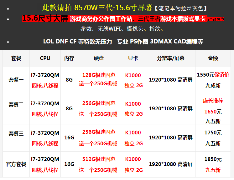 | 16G | M2 NVME 256G Скорость твердое | Нвидия NVIDIA Графическая графическая карта T2000 Независимый 4G | 15,6 дюйма 1920*1080P Экран IPS | Менеджер магазина рекомендует 3888 юаней. 90 % новый Рисунок 3D дизайнОружие После купона 2836 | ||