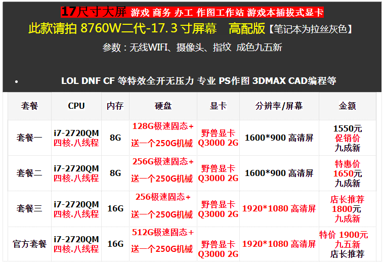 | 16G | M2 NVME 512G Скорость твердое | Нвидия Литаи Графическая графическая карта P2000 Независимый 4G | 17 дюймов 1920*1080P Экран IPS | Изначальная цена 3588 Юань 90 % новый Рисунок 3D дизайнОружие После купона 2618 | ||