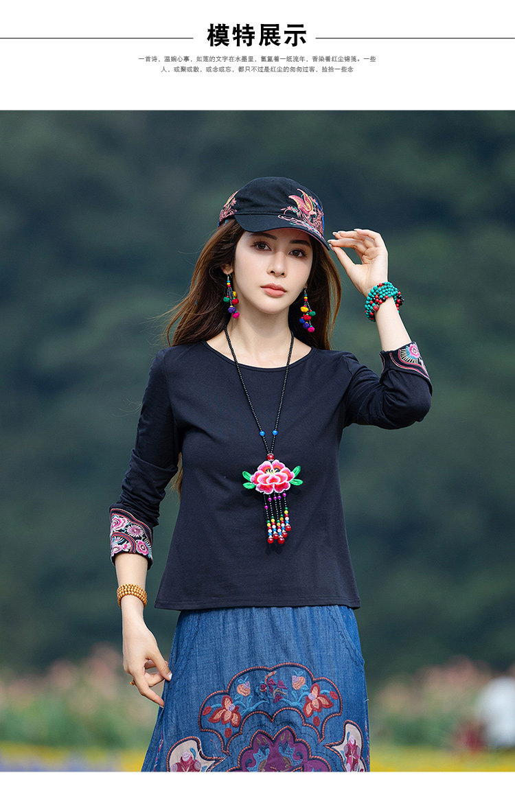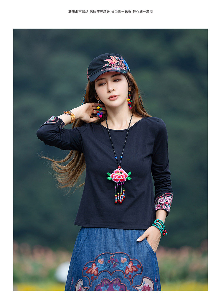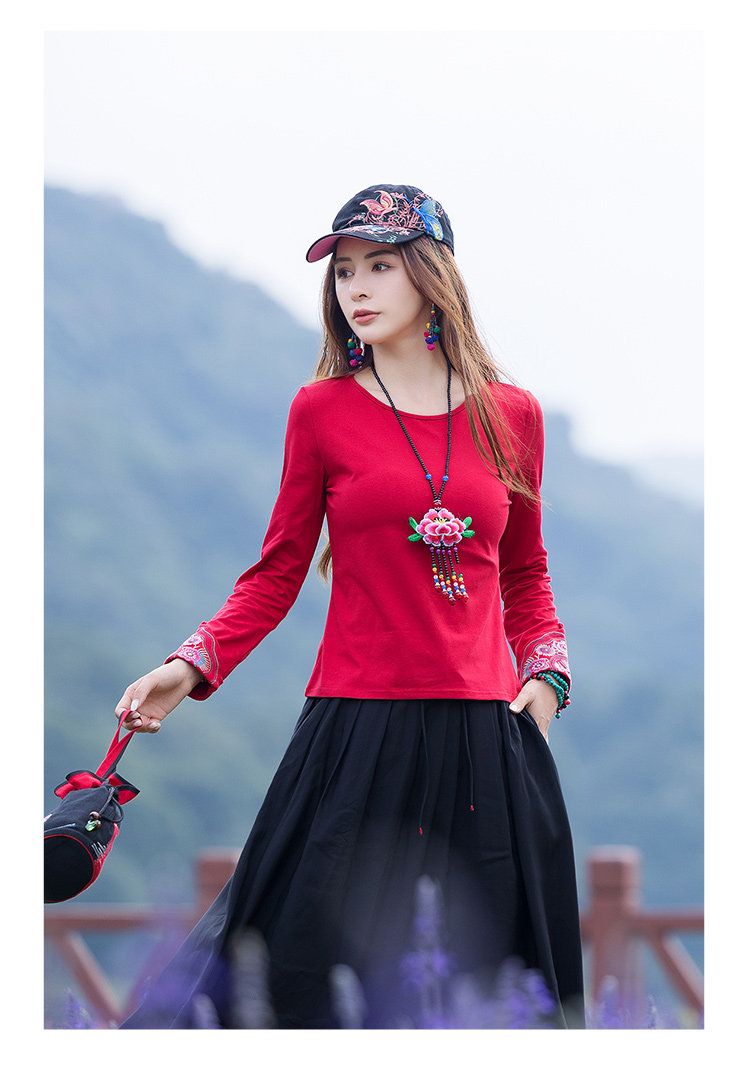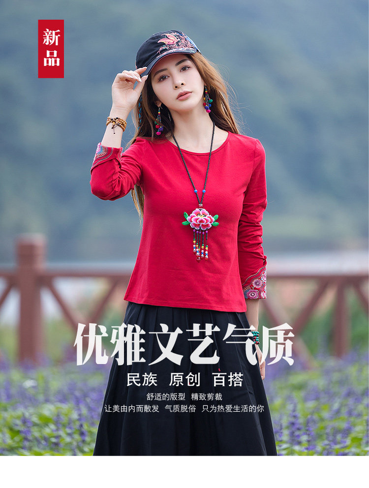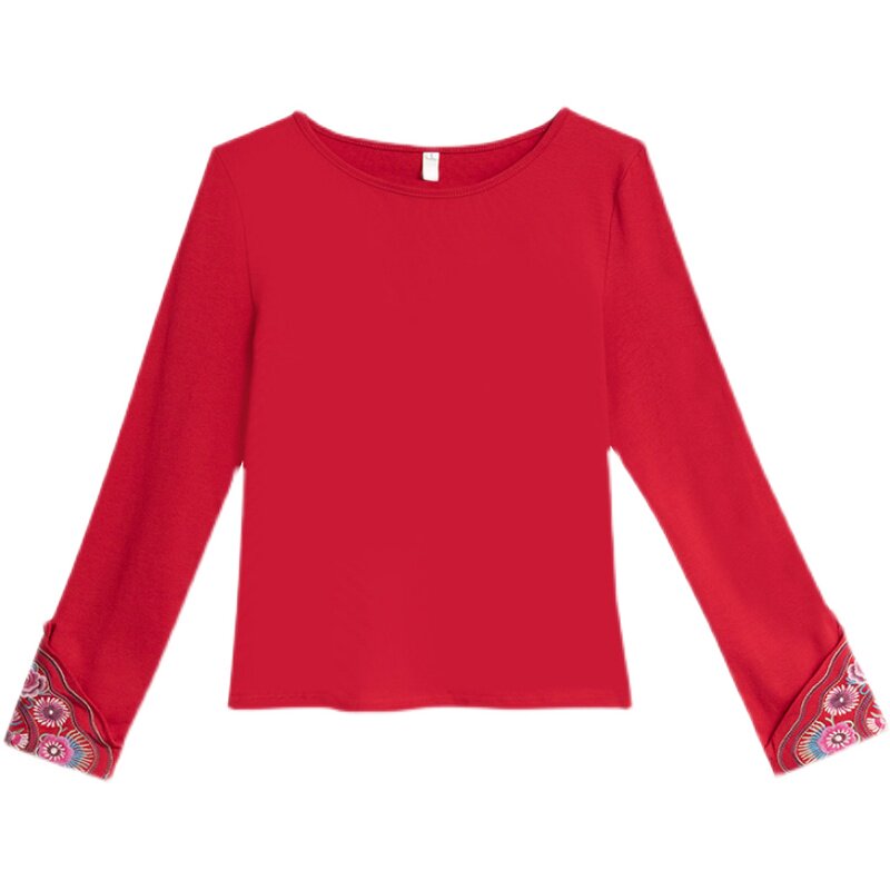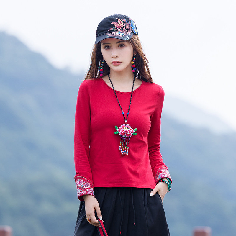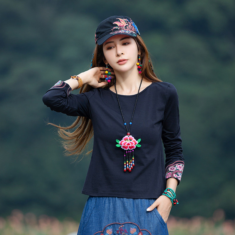 Этнический базовый лонгслив с круглым воротником, хлопковая футболка, 2021 года, городской стиль, этнический стиль, с вышивкой, облегающий крой