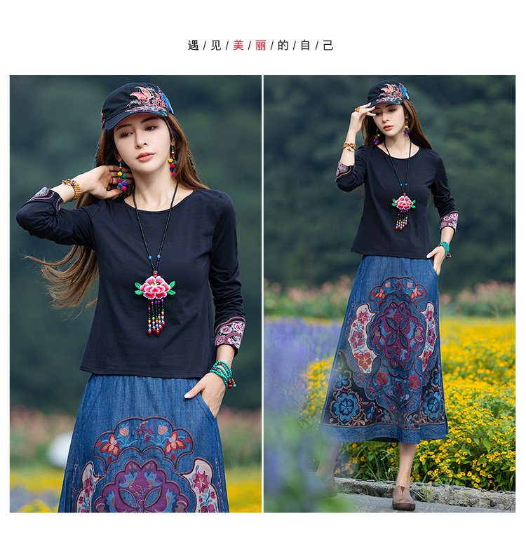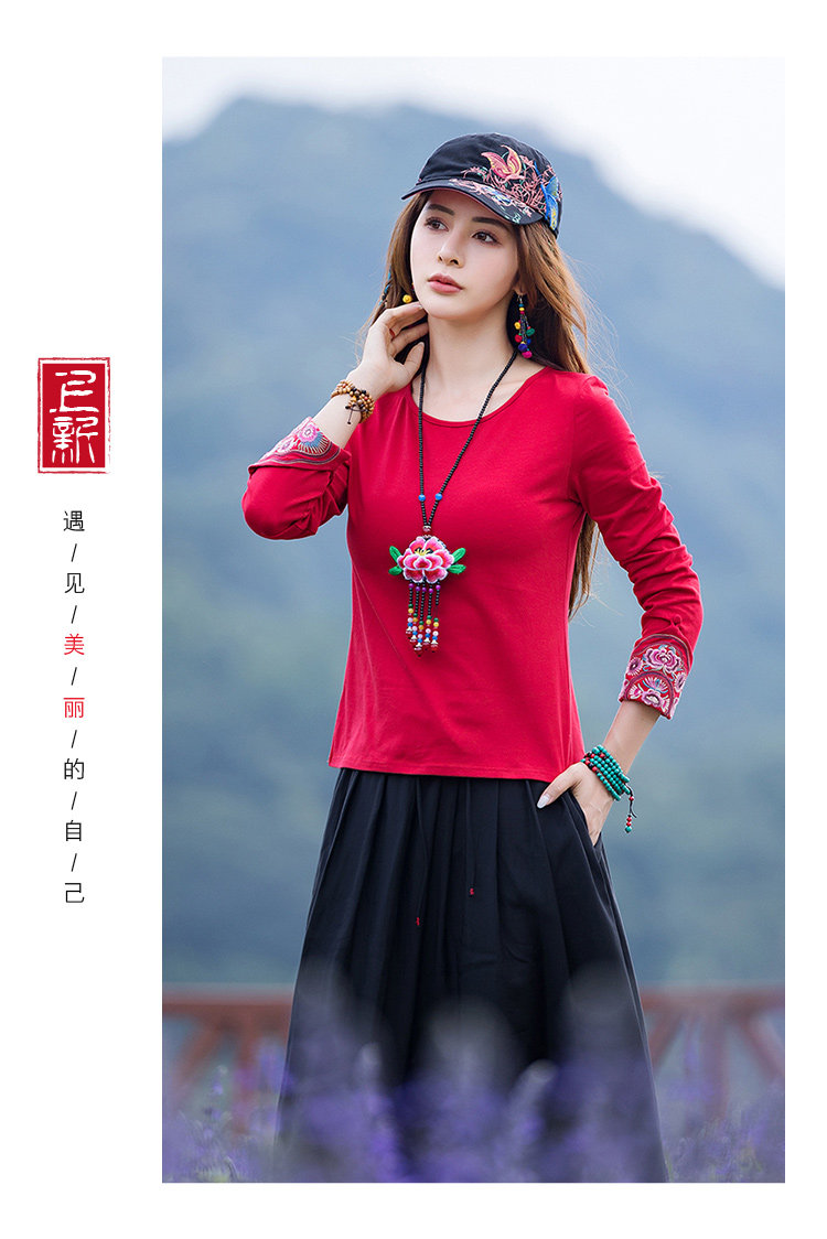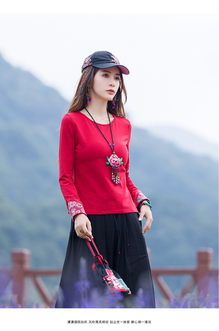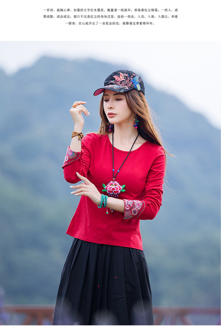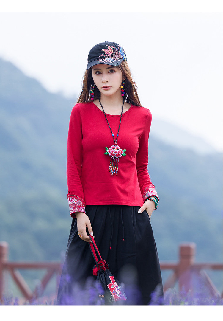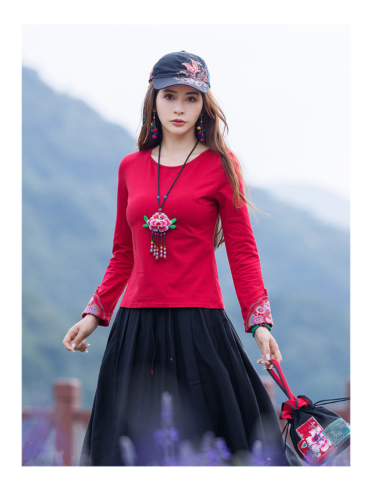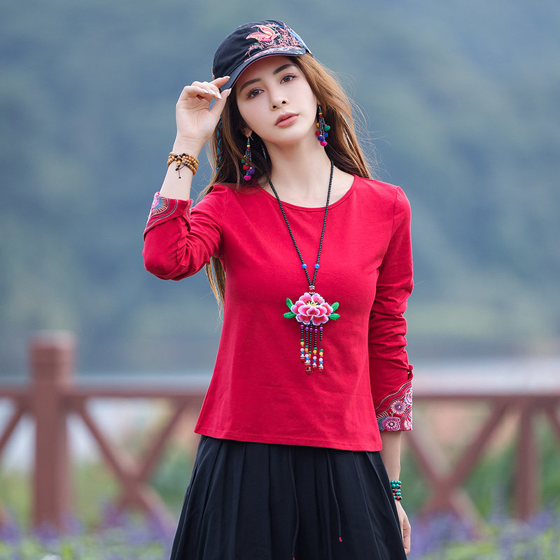 Этнический базовый лонгслив с круглым воротником, хлопковая футболка, 2021 года, городской стиль, этнический стиль, с вышивкой, облегающий крой