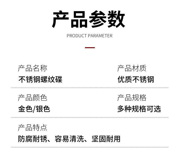 | Цвет: | [9cm螺纹餐碟(银色)], [10cm螺纹餐碟(银色)], [12cm螺纹餐碟(银色)], [13.5cm螺纹餐碟(银色)], [9cm螺纹餐碟(钛金色)], [10cm螺纹餐碟(钛金色)], [12cm螺纹餐碟(钛金色)], [13.5cm螺纹餐碟(钛金色)] |