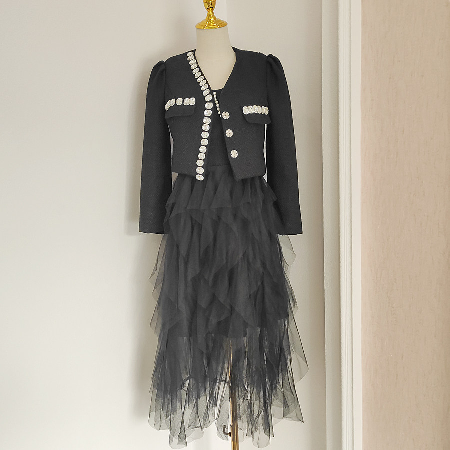 Платье в женском стиле из сетки с подтяжками из бисера + короткое пальто с инкрустацией бриллиантами, осенний комплект из двух предметов