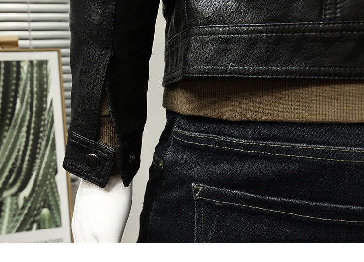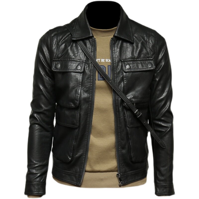 Много -карманная черная лацканая кожаная пальто, красивая пилотная кожа