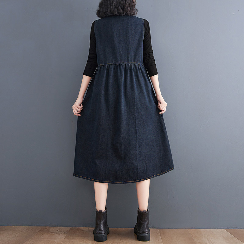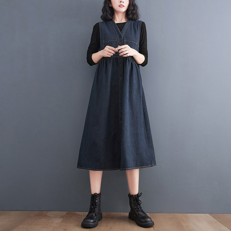 Ретро осеннее длинное джинсовое платье без рукавов для отдыха, большой размер, коллекция 2021, средней длины, V-образный вырез, по фигуре