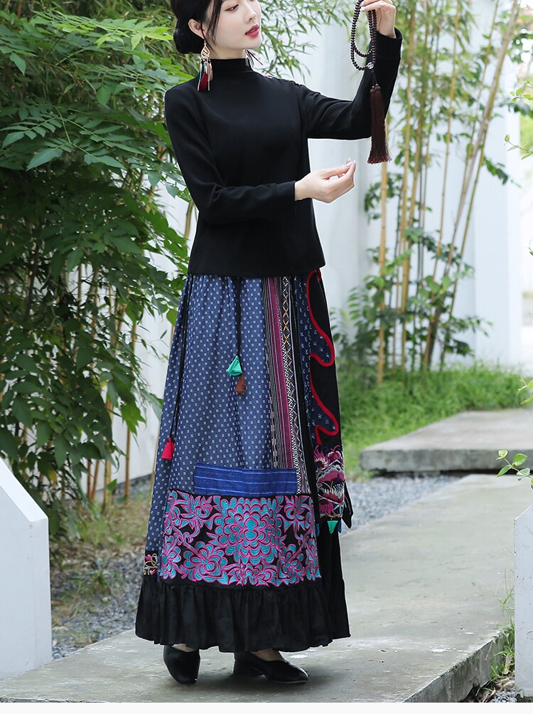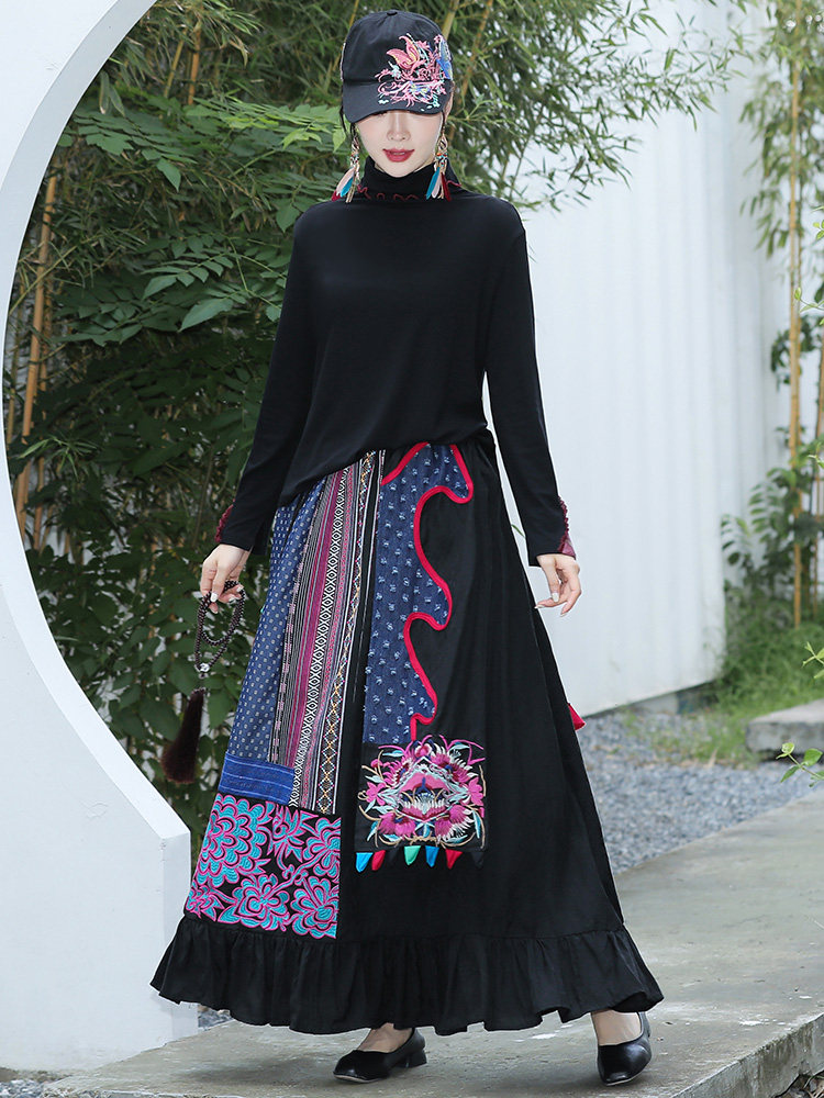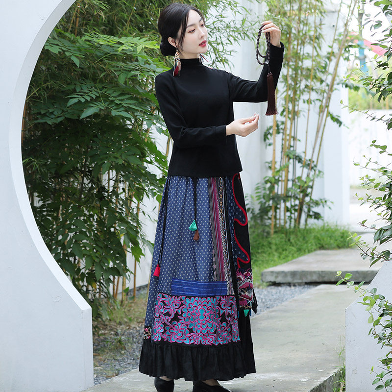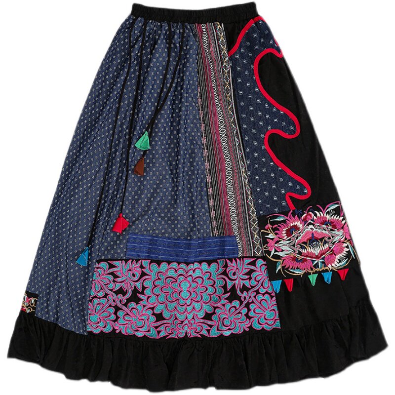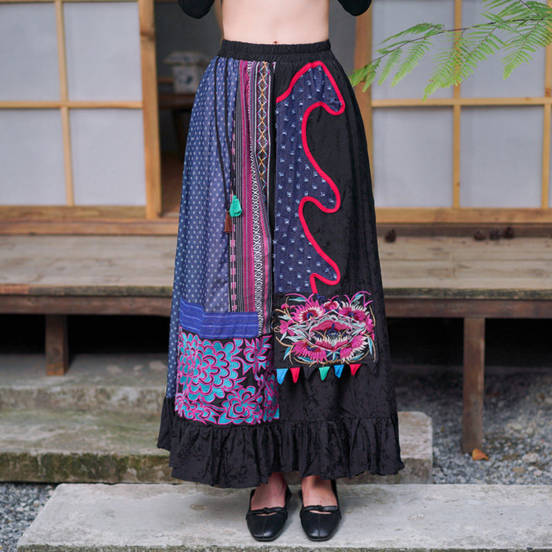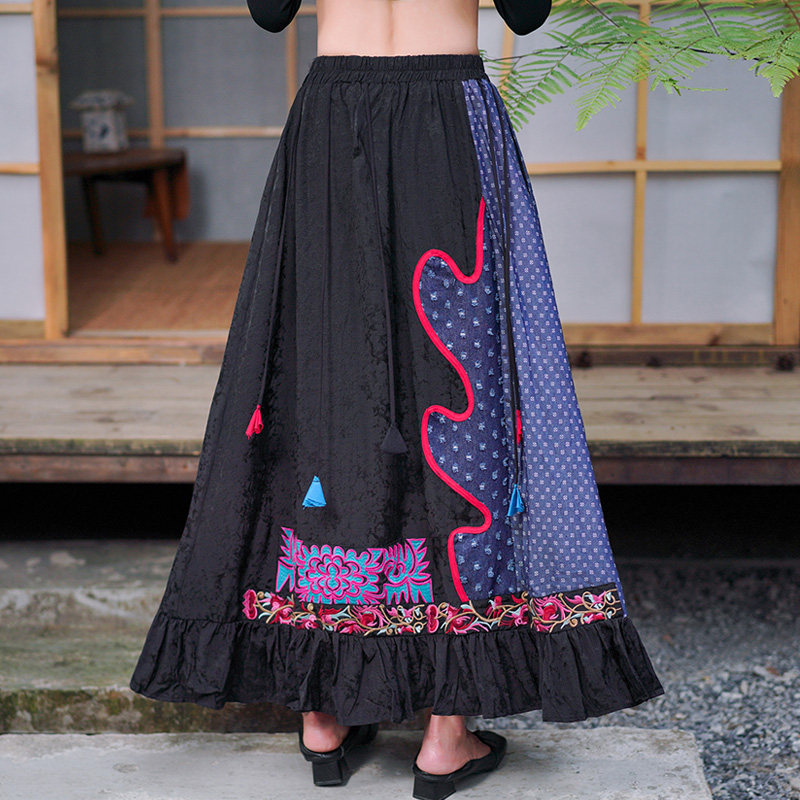 Этническая ретро ткань, длинная юбка, этнический стиль, из хлопка и льна, эластичная талия, А-силуэт