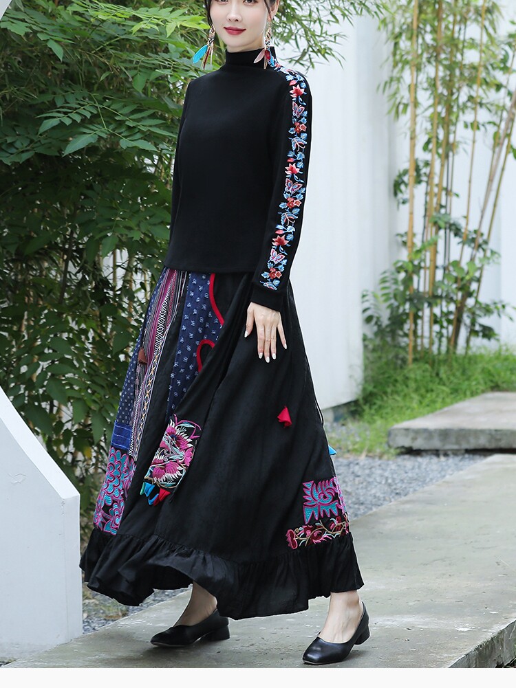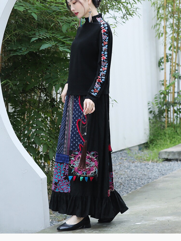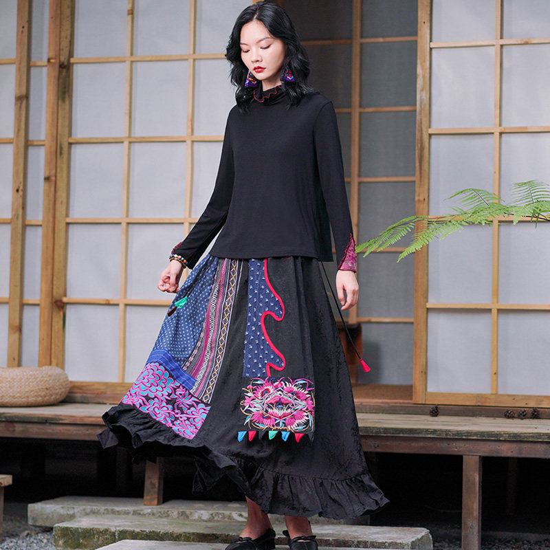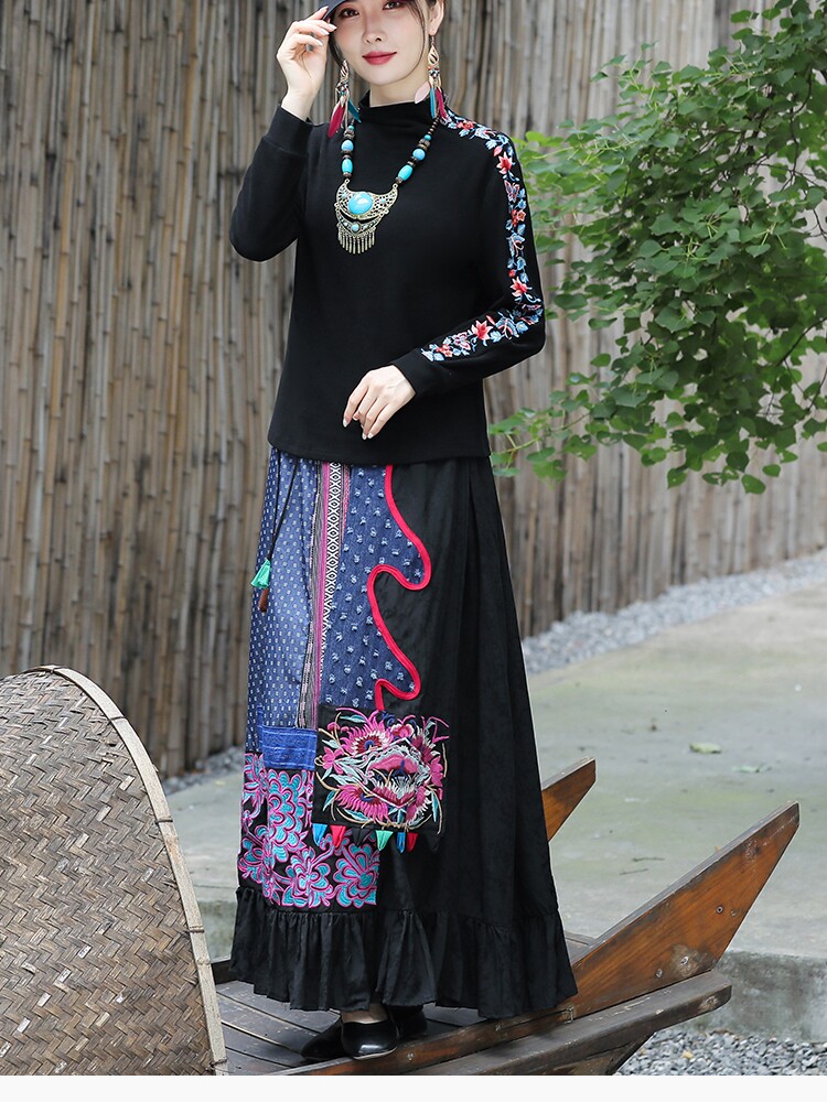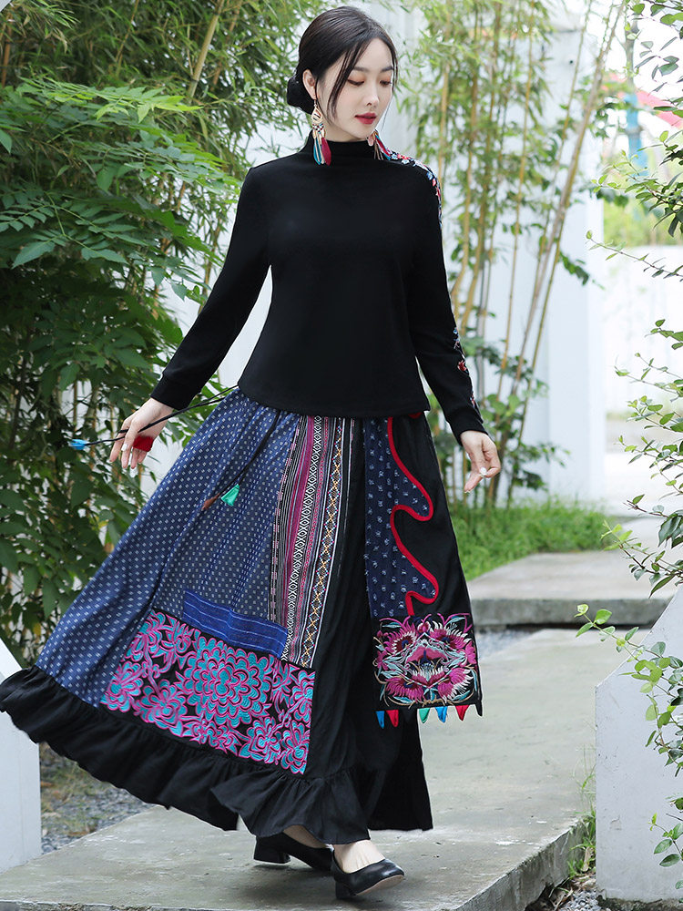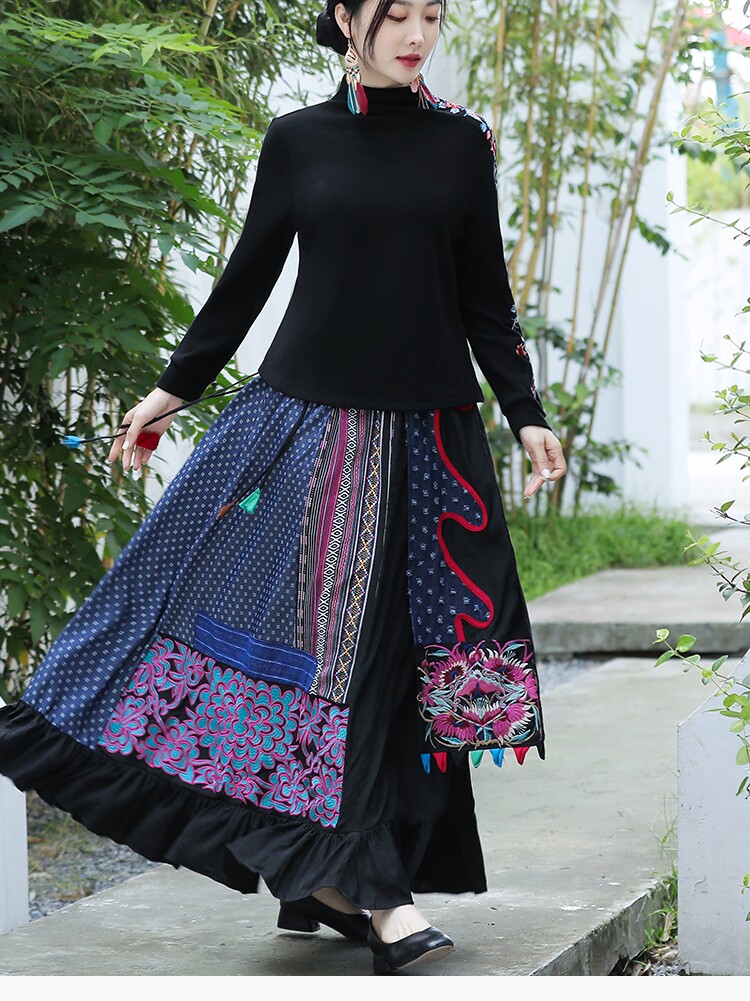 Этническая ретро ткань, длинная юбка, этнический стиль, из хлопка и льна, эластичная талия, А-силуэт