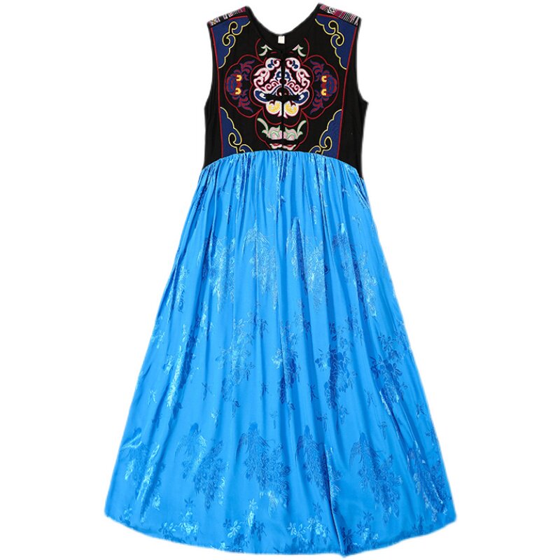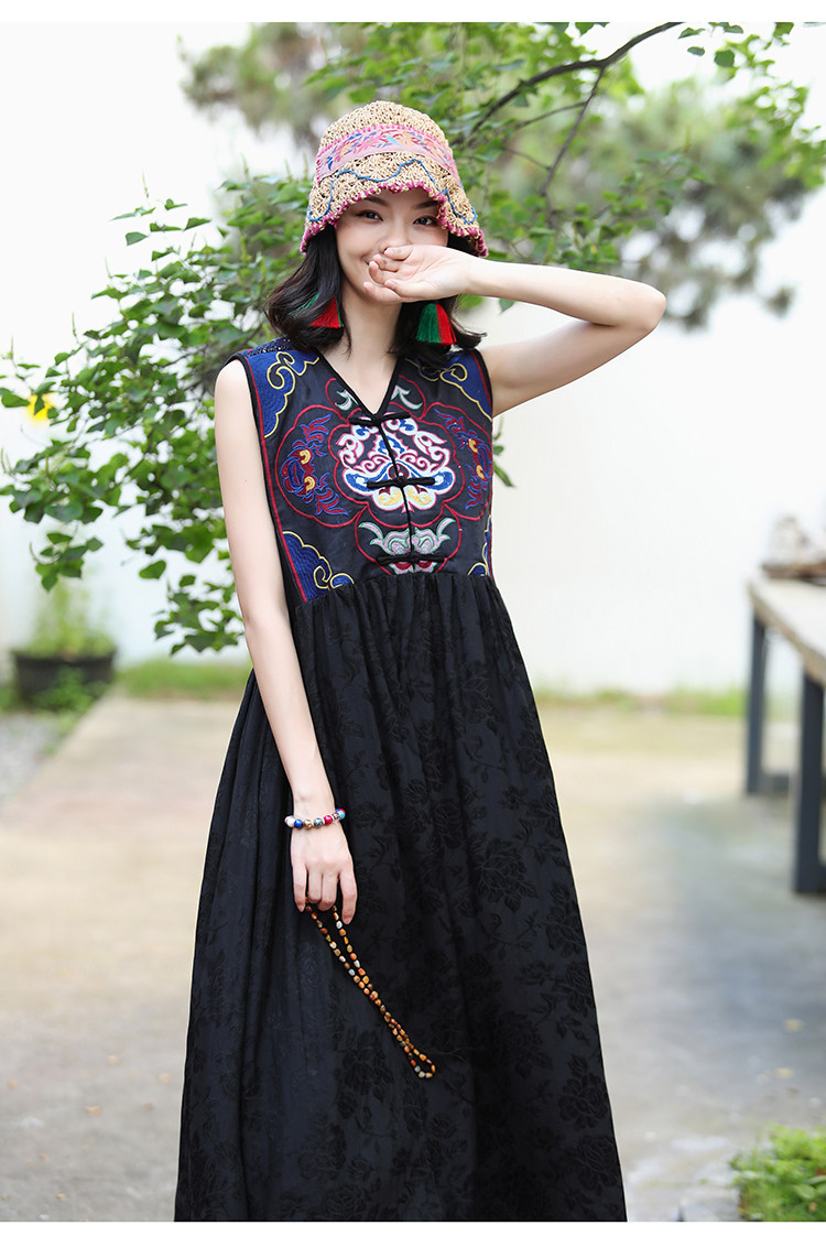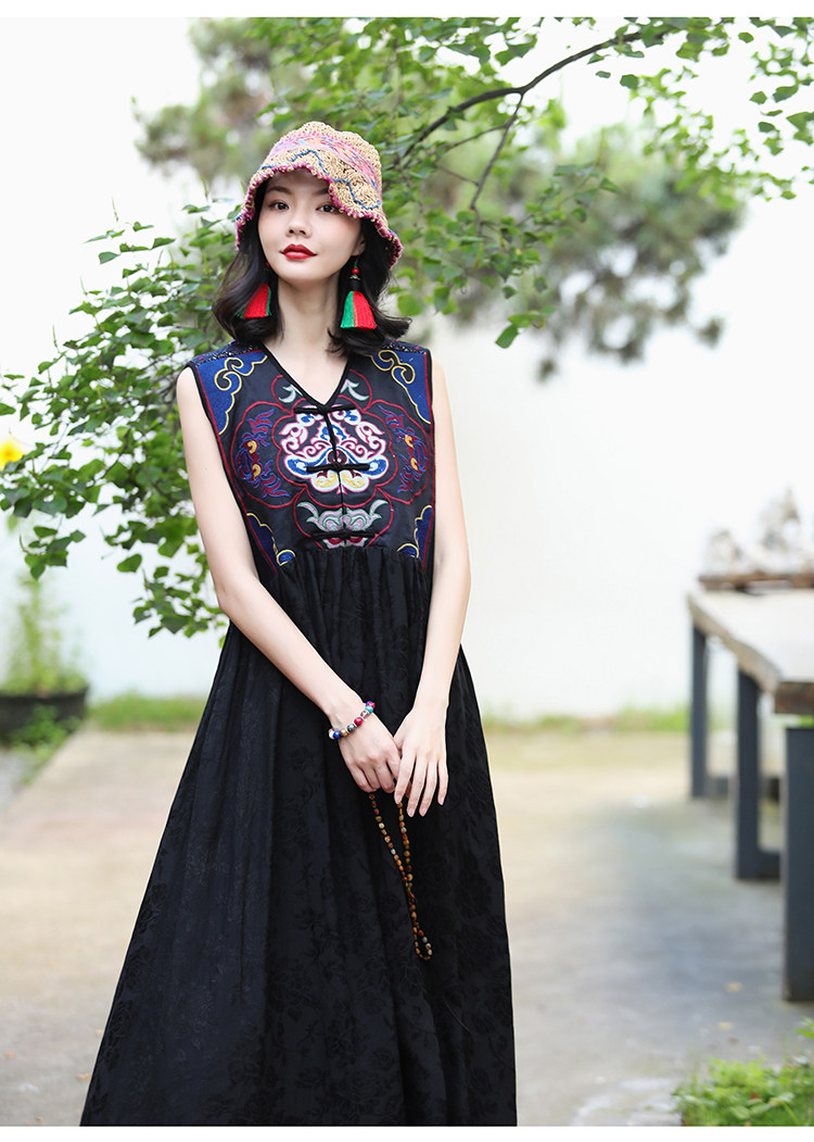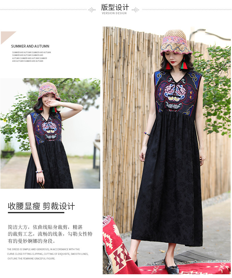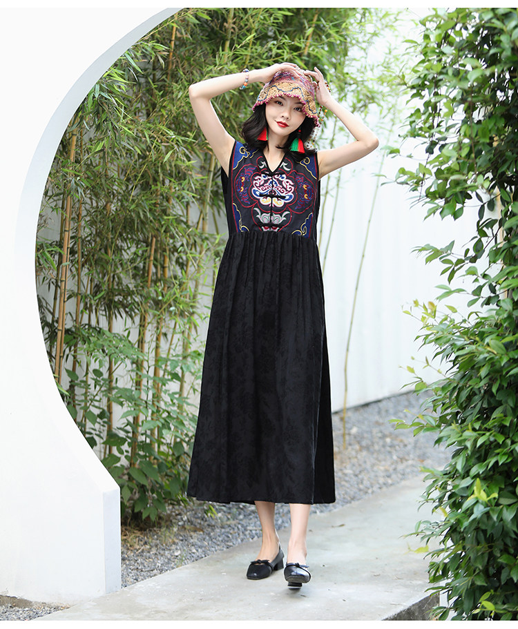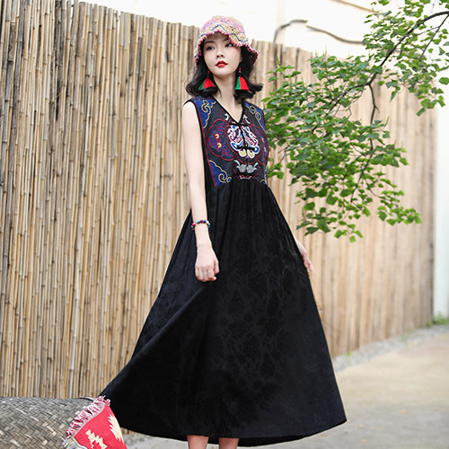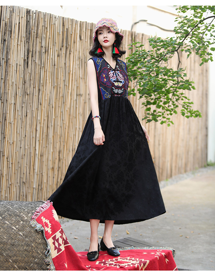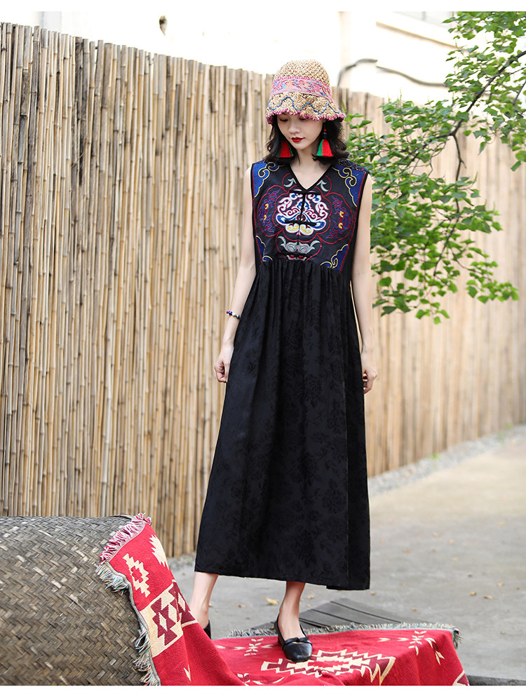 Этническая длинная юбка, платье без рукавов, этнический стиль, с вышивкой, V-образный вырез, А-силуэт