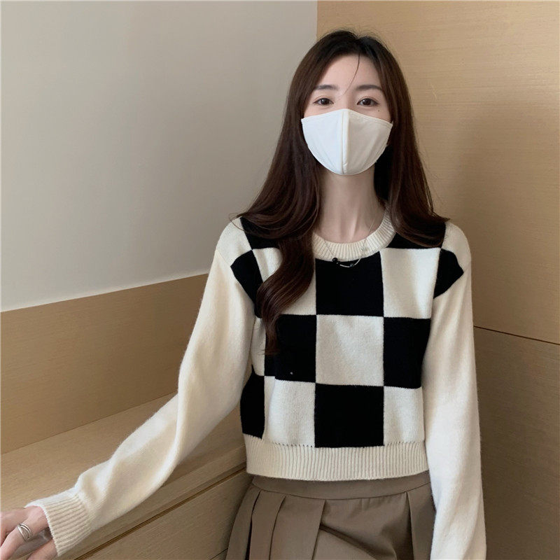 Шахматы, короткий свитер, лонгслив, в корейском стиле, новая коллекция