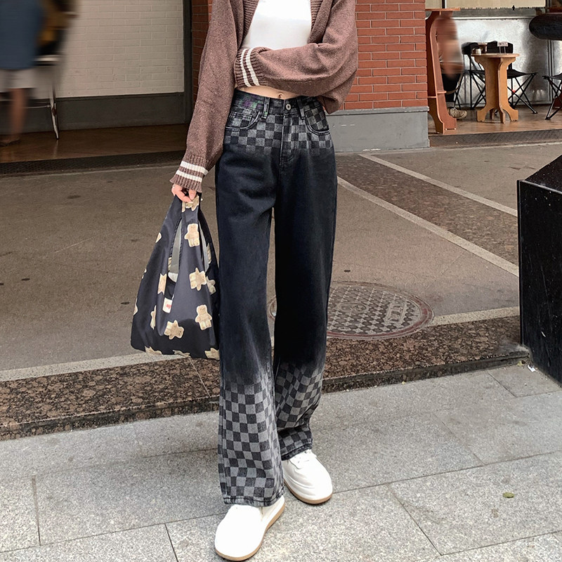 Шахматы, джинсы, приталенные универсальные штаны, градиент, свободный прямой крой, высокая талия