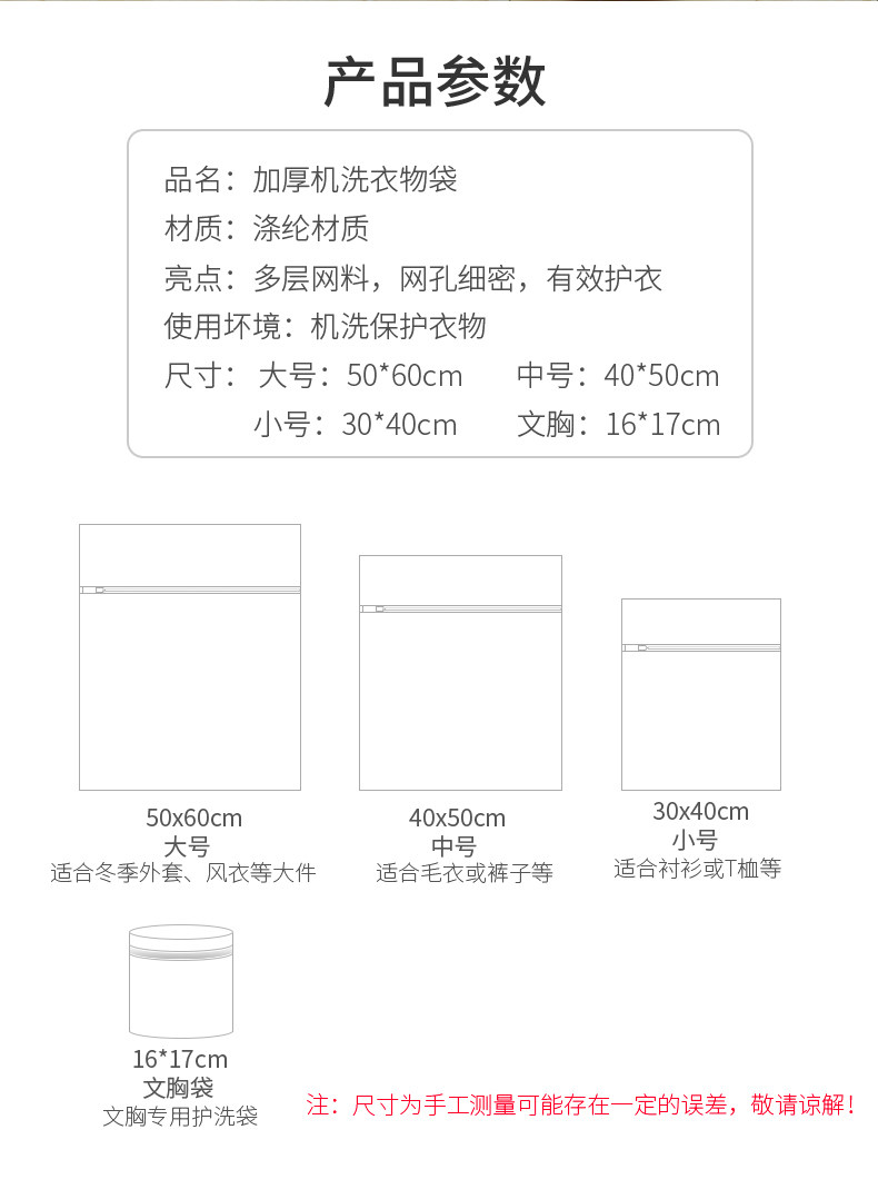 | Цвет: | [中号细网50*40(毛衣)], [大号细网60*50(大衣)], [特大细网60*60(羽绒服)], [文胸专用袋17*16cm], [两个文胸专用袋17*16cm], [细网三件套(大号+中号+小号)], [细网四件套(特大+大中小)], [细网四件套(大中小+加厚文胸袋], [细网五件套(特大+大号*2+中小)], [细网五件套(特大+大中小+文胸袋], [细网六件套], [细网六件套(含加厚文胸袋)], [小号细网40*30(衬衫)] |