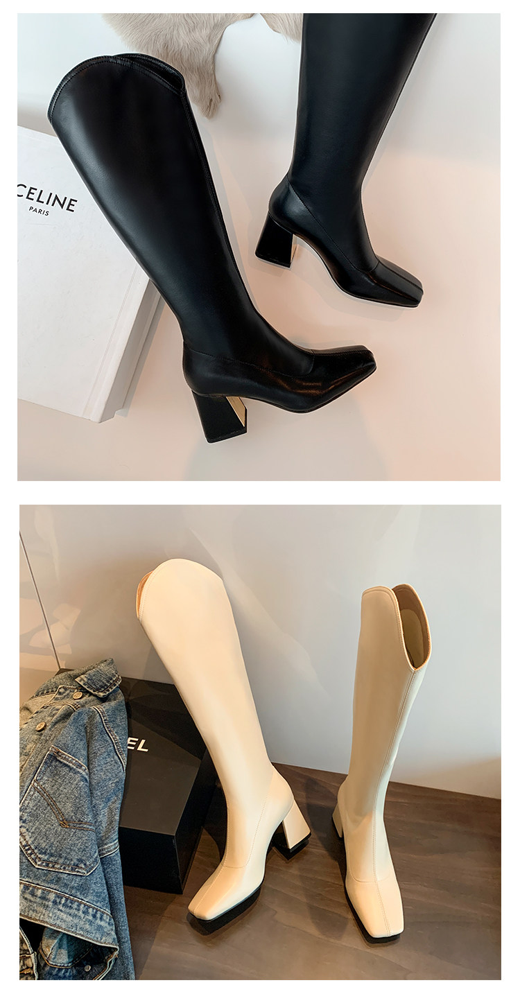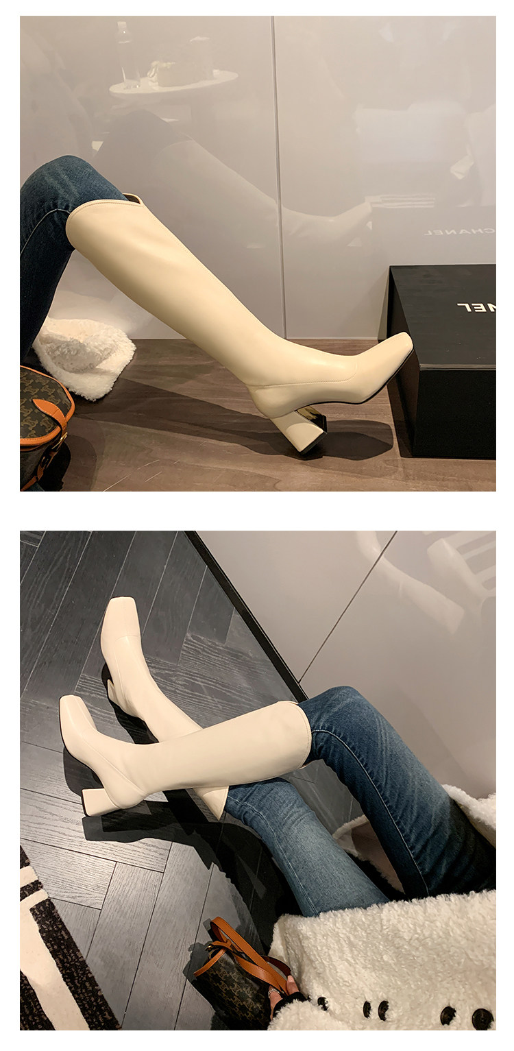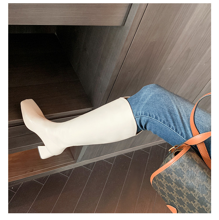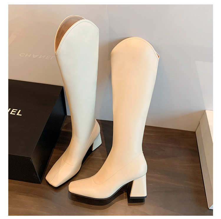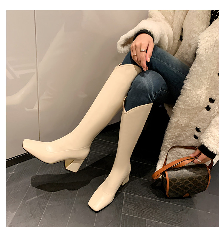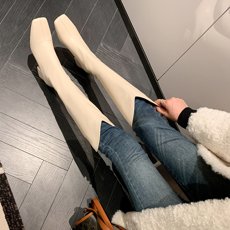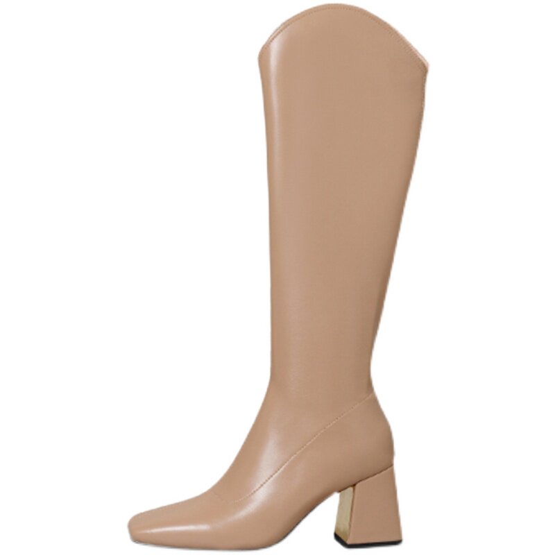 Женские ботинки с V-образным квадратным носком, рыцарские сапоги, высокие каблуки, толстые каблуки, высокие сапоги на резинке, узкие сапоги без колен, цвет молочного чая.