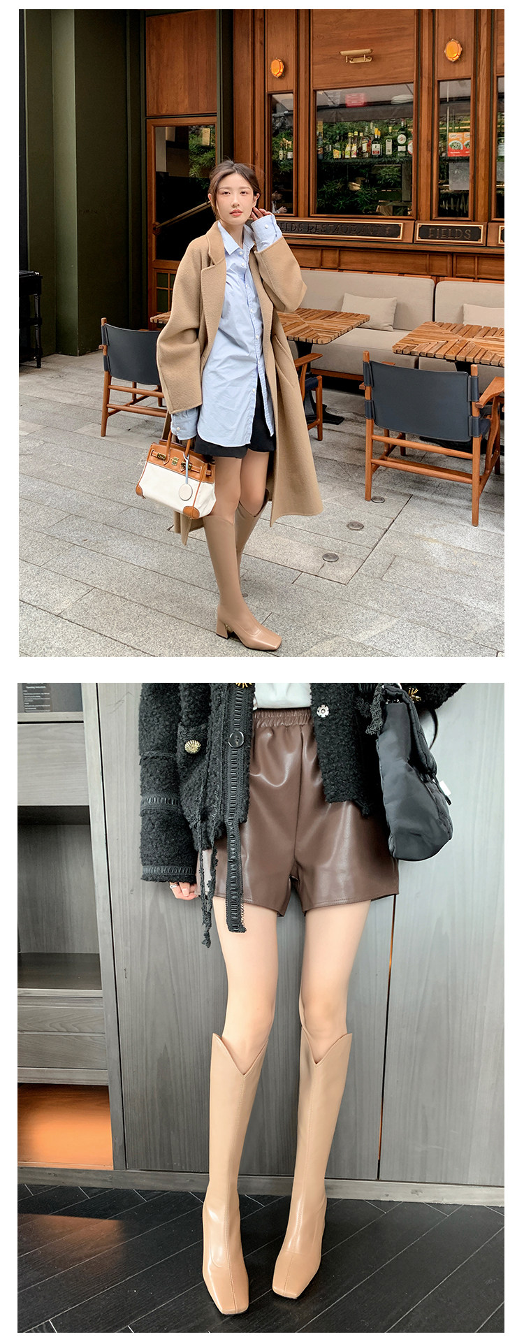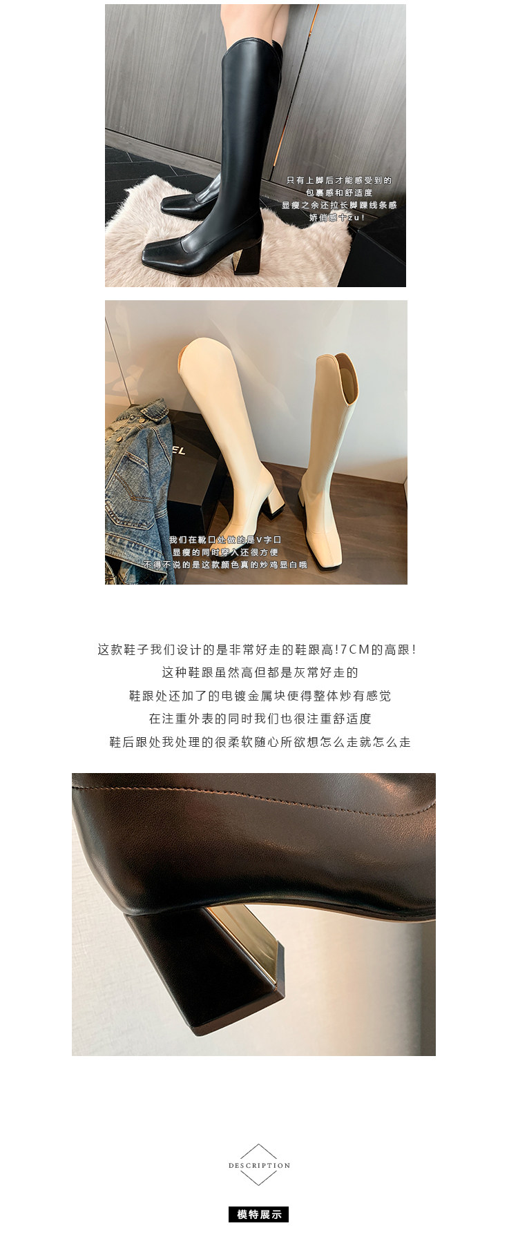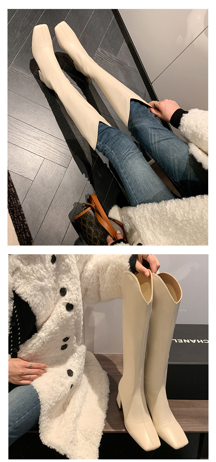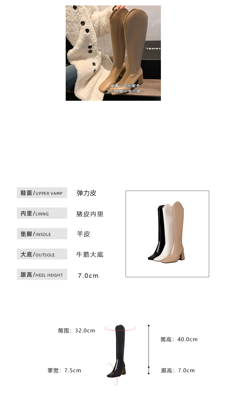Женские ботинки с V-образным квадратным носком, рыцарские сапоги, высокие каблуки, толстые каблуки, высокие сапоги на резинке, узкие сапоги без колен, цвет молочного чая.