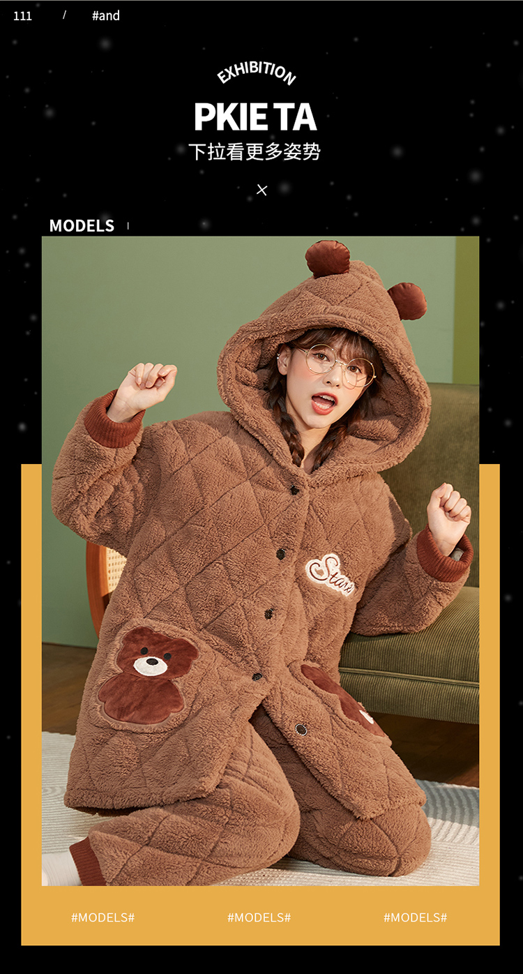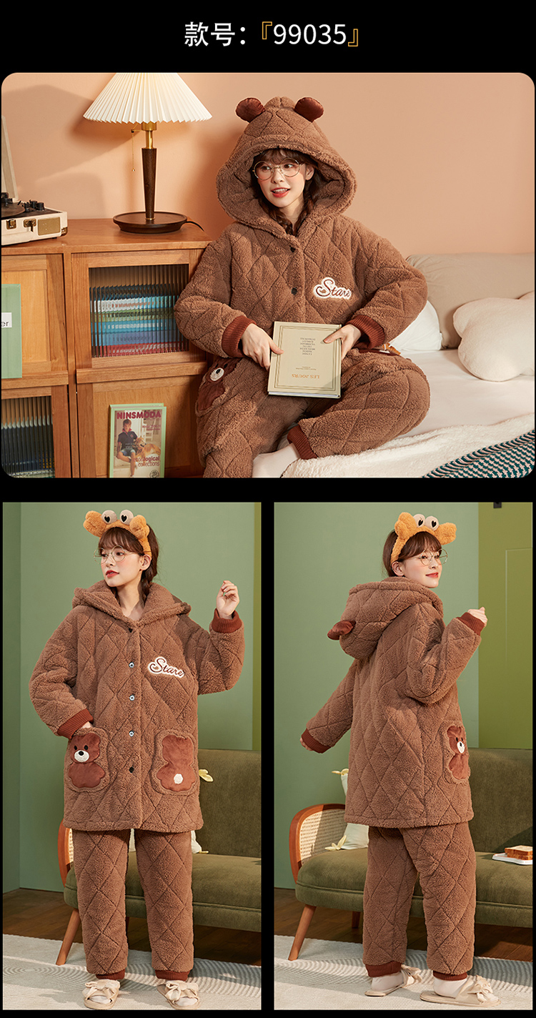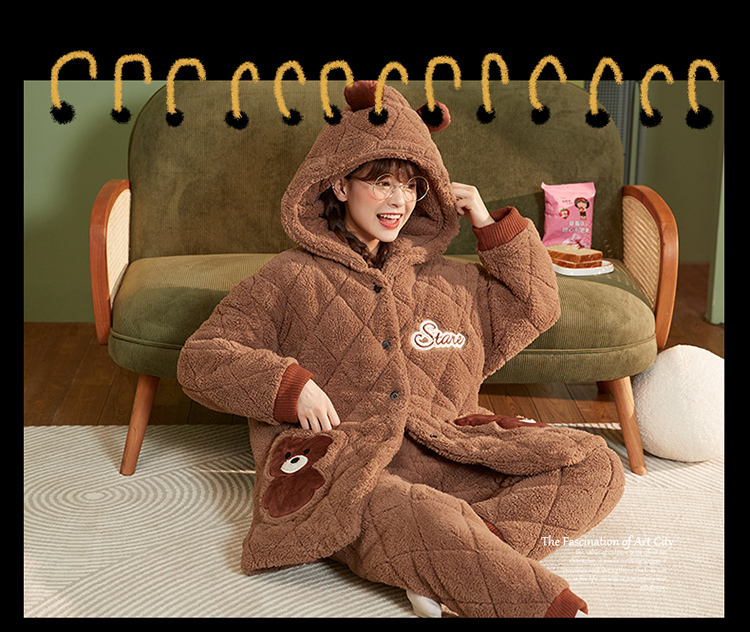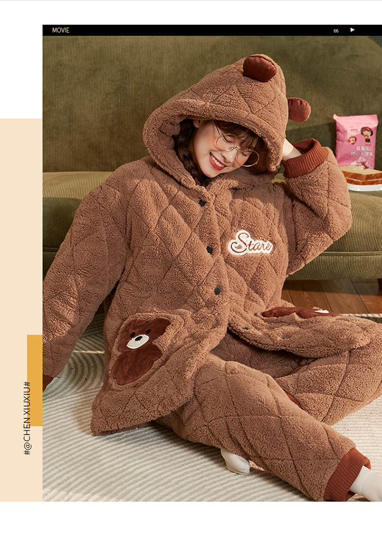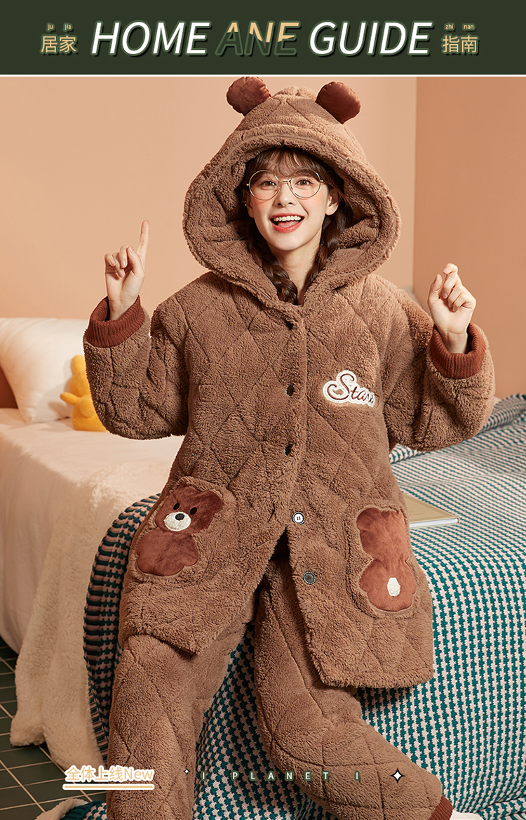 Зимняя коралловая бархатная утепленная стеганая пижама, мультяшный фланелевый комплект, с медвежатами