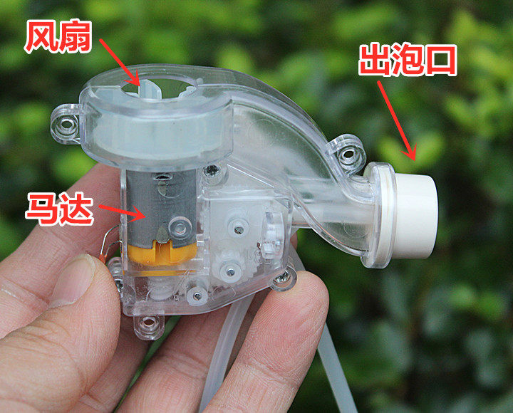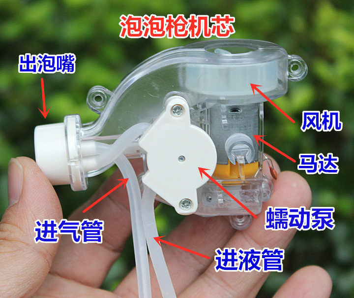 Принцип работы движения, вероятно,: когда двигательное движение накачивает мыльный насос через входную трубку входной трубки, стержень вращения во рту пузырь Воздушный поток фен можно непрерывно взорвать.