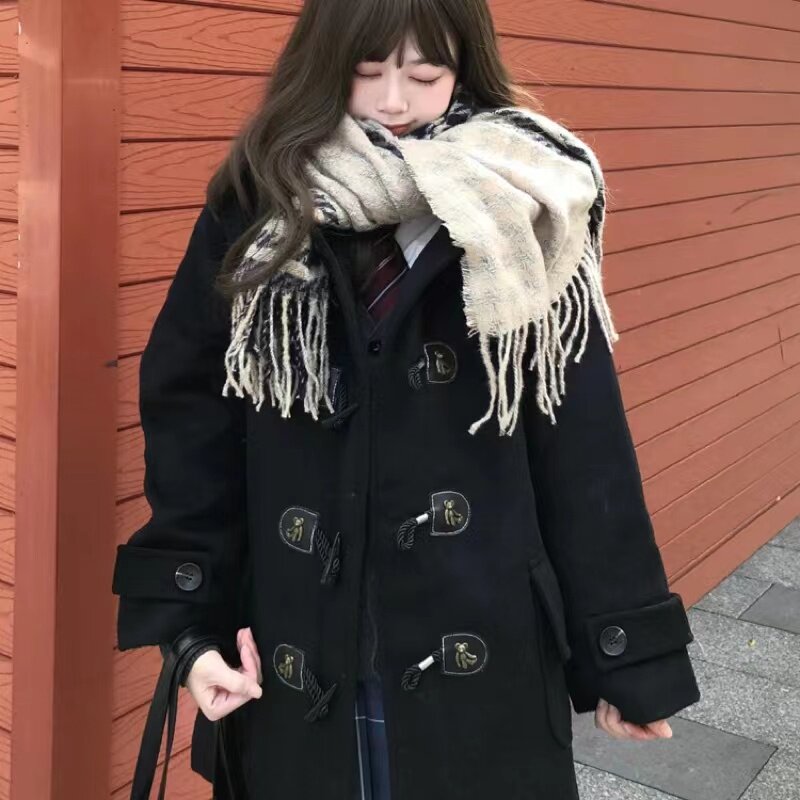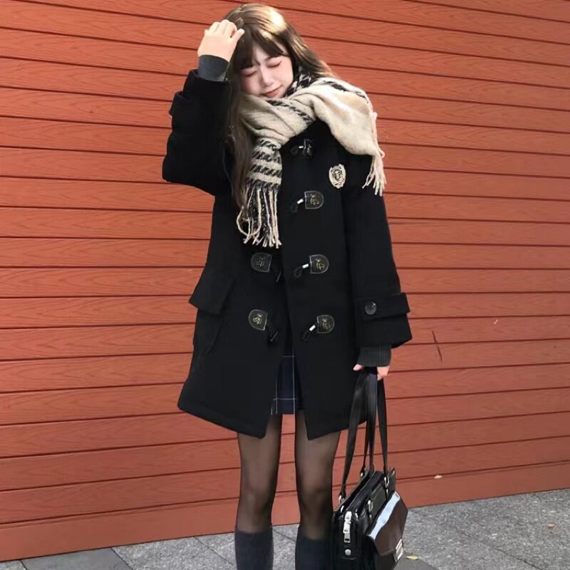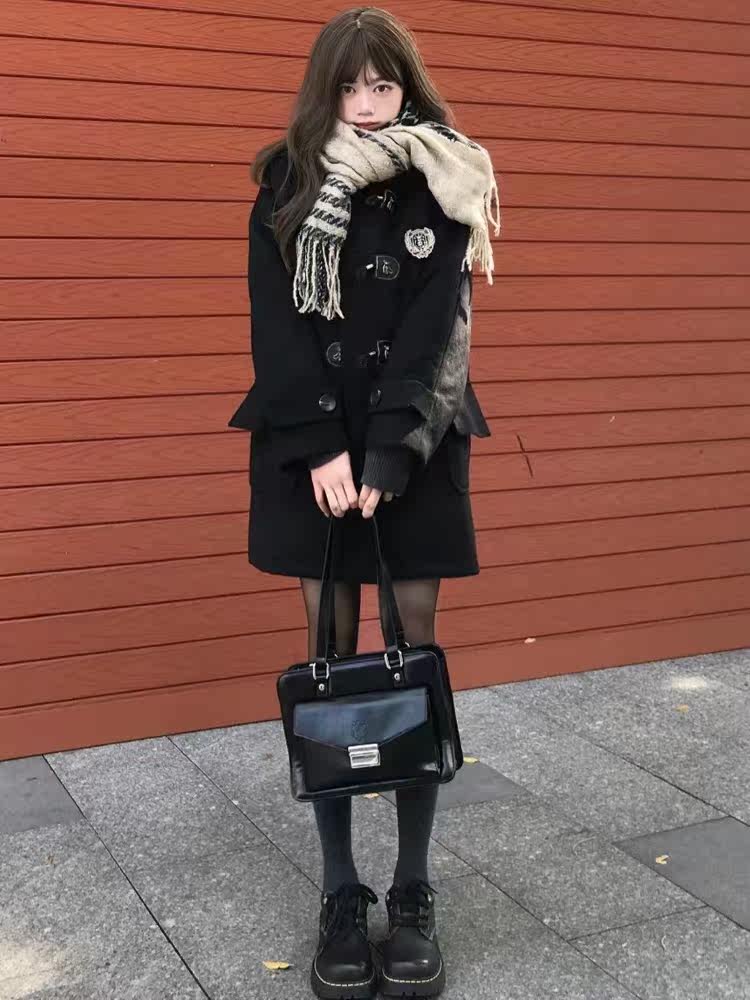 Зимняя студенческая юбка в складку, черное шерстяное пальто, куртка
