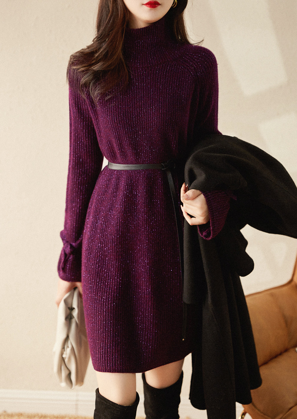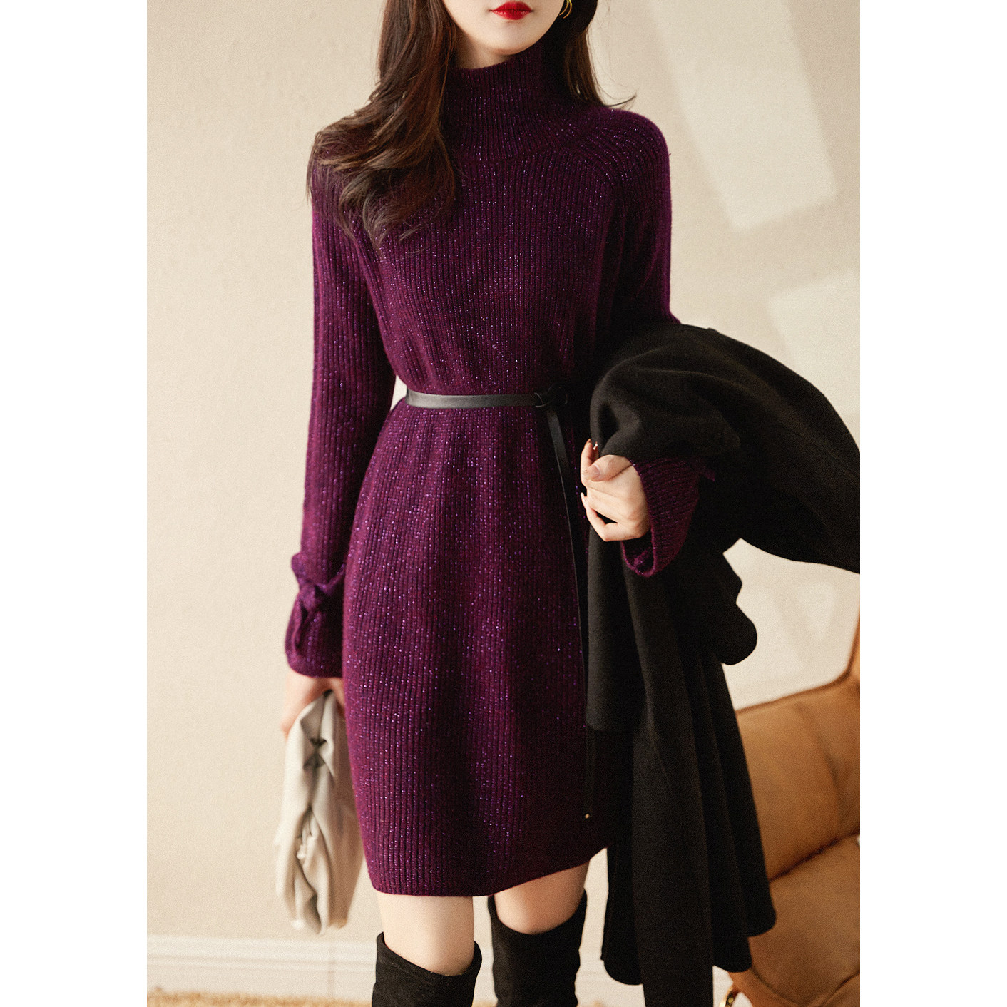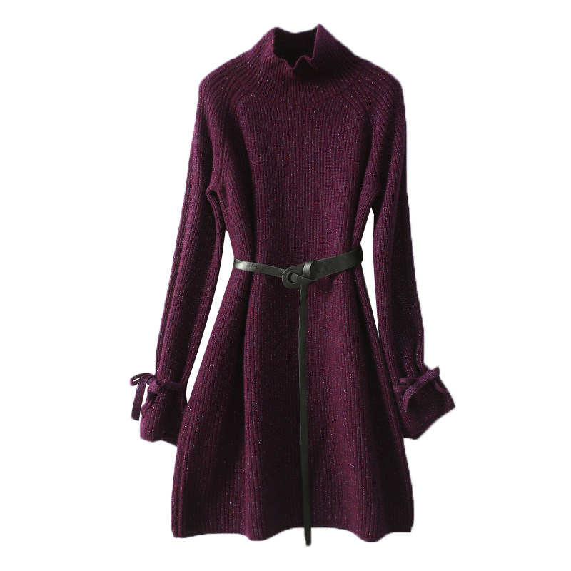 Элегантное шерстяное платье, юбка, модный лонгслив, высокий воротник