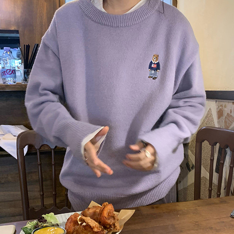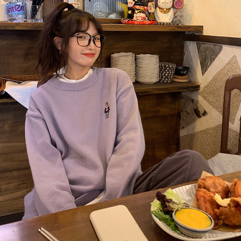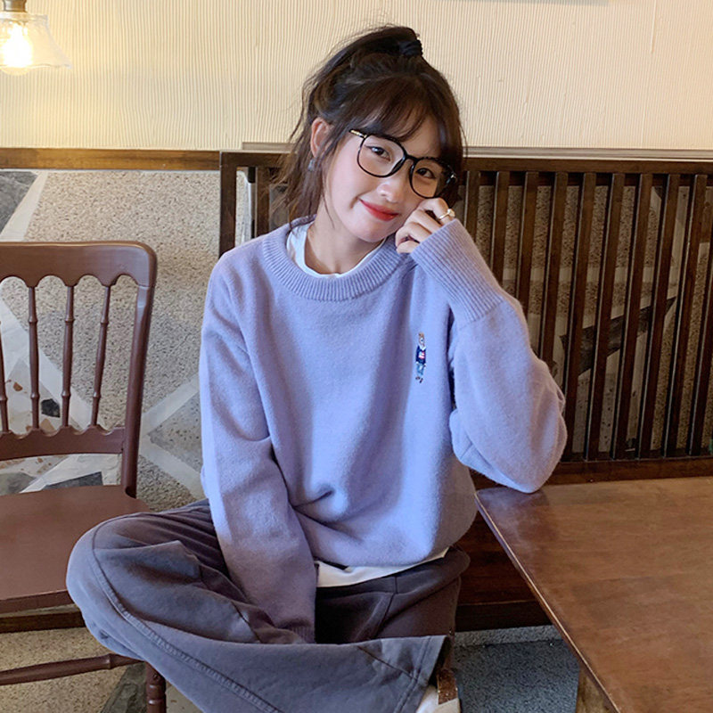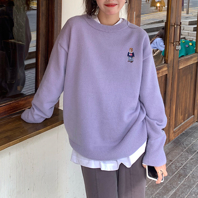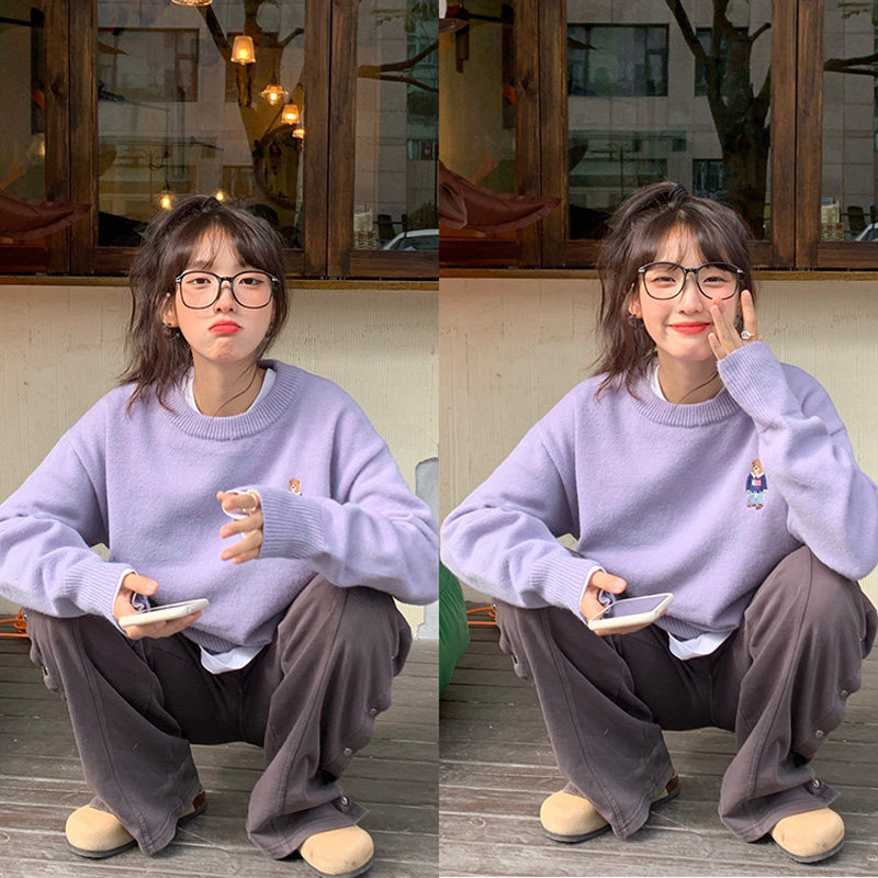 Сиреневый дизайнерский мультяшный трикотажный свитер, тренд сезона, свободный крой, с вышивкой