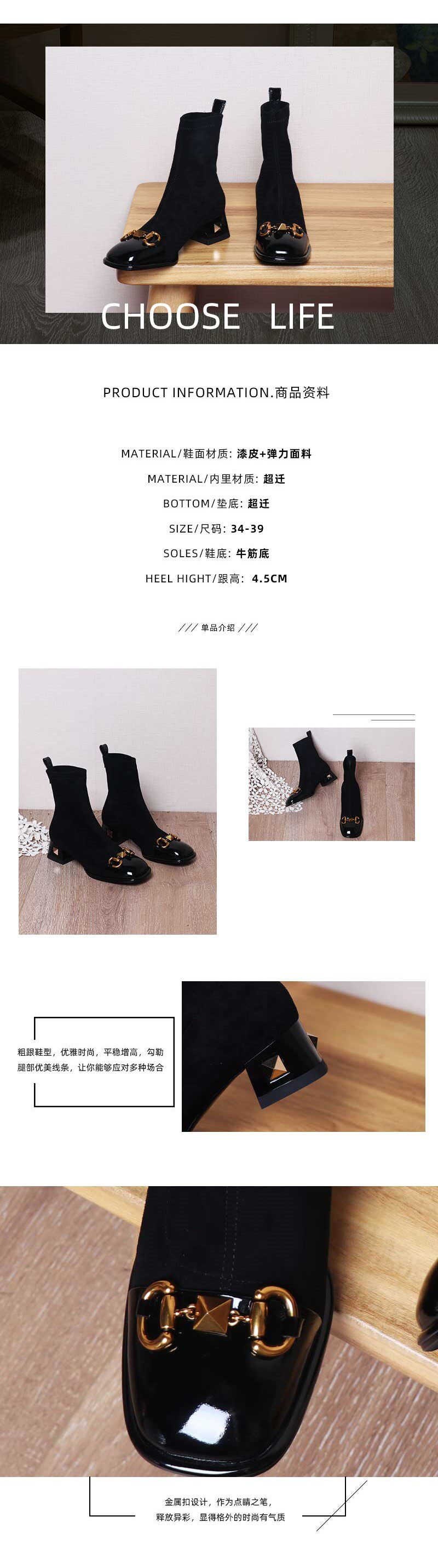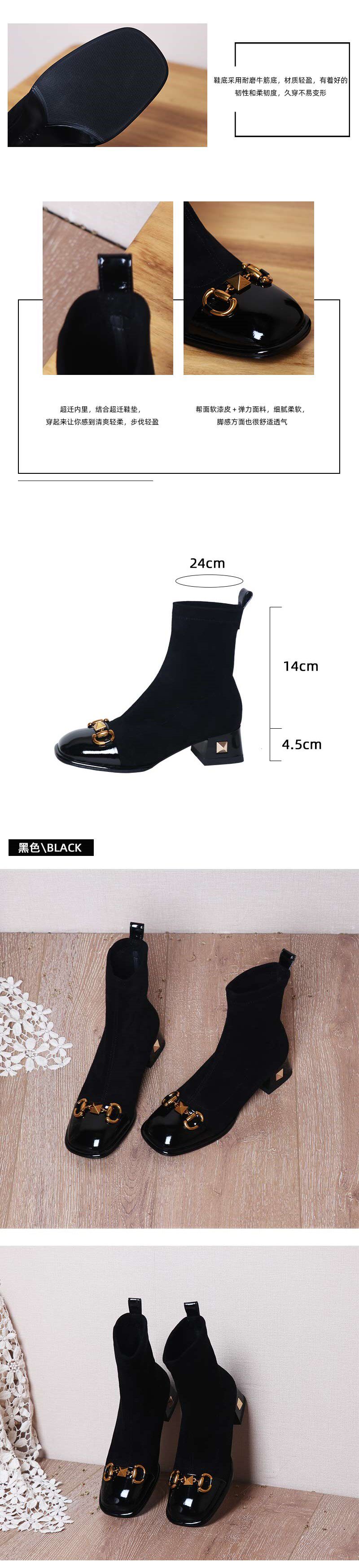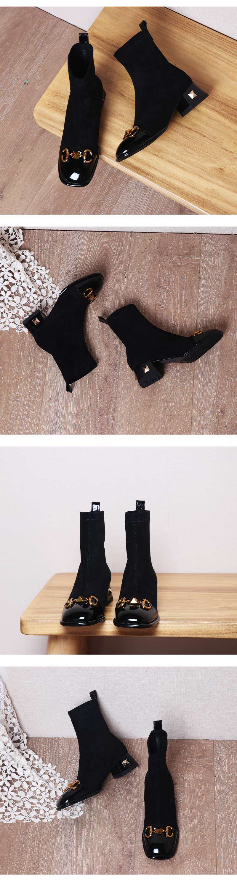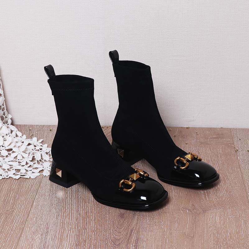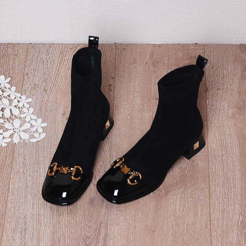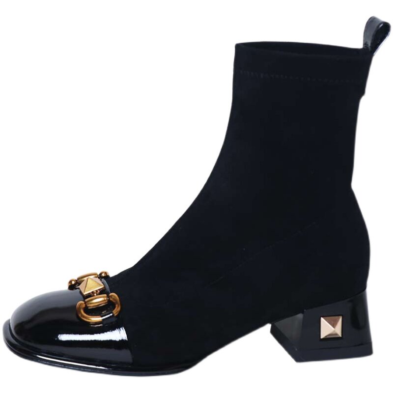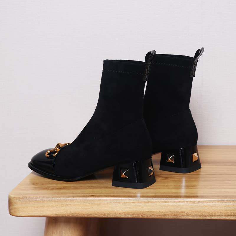 Возрастные короткие ботинки для женщин 2025 Новые толстые упругие сапоги на каблуках осень и зимние заклепки носки для сапог для похудения квадратные ноги