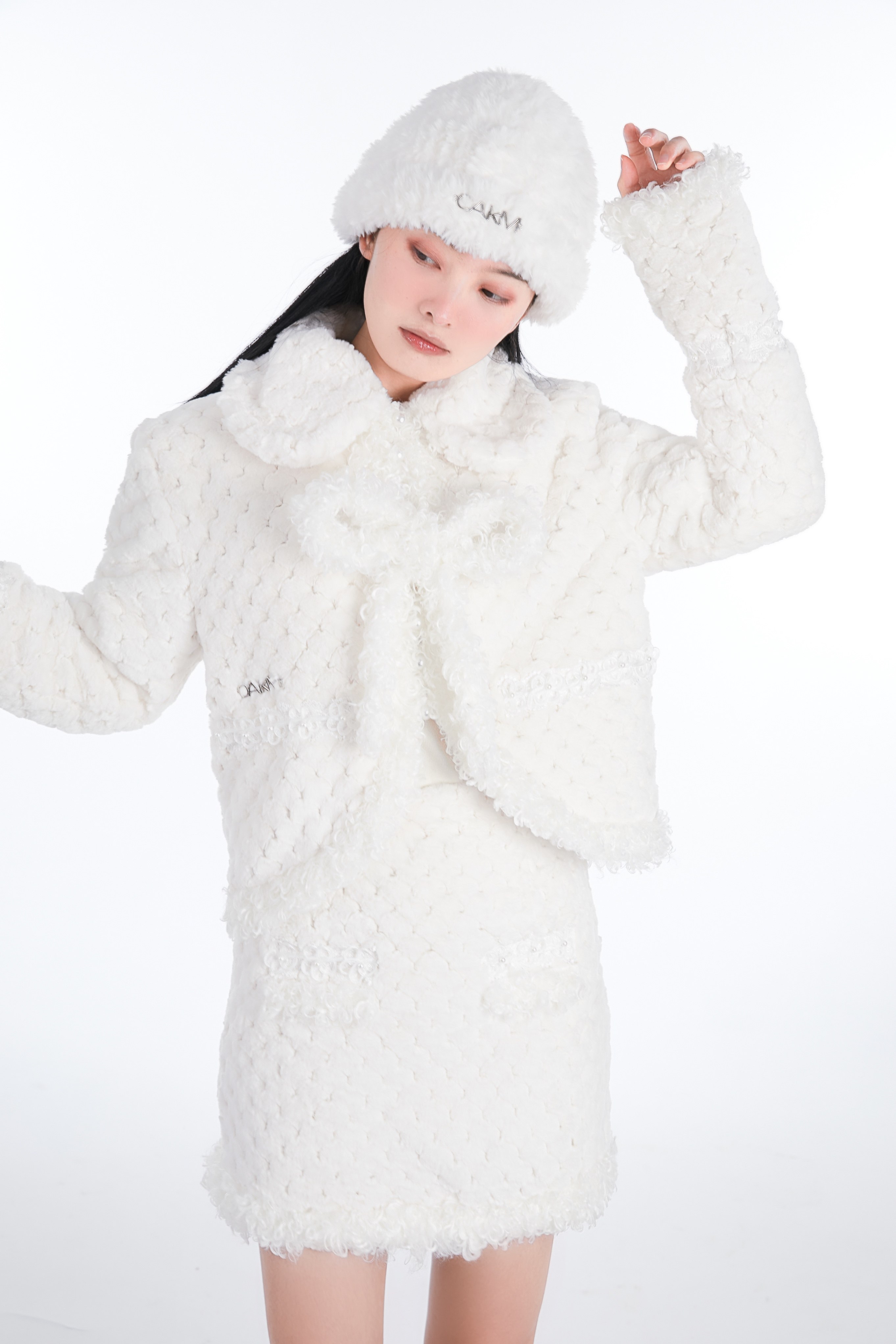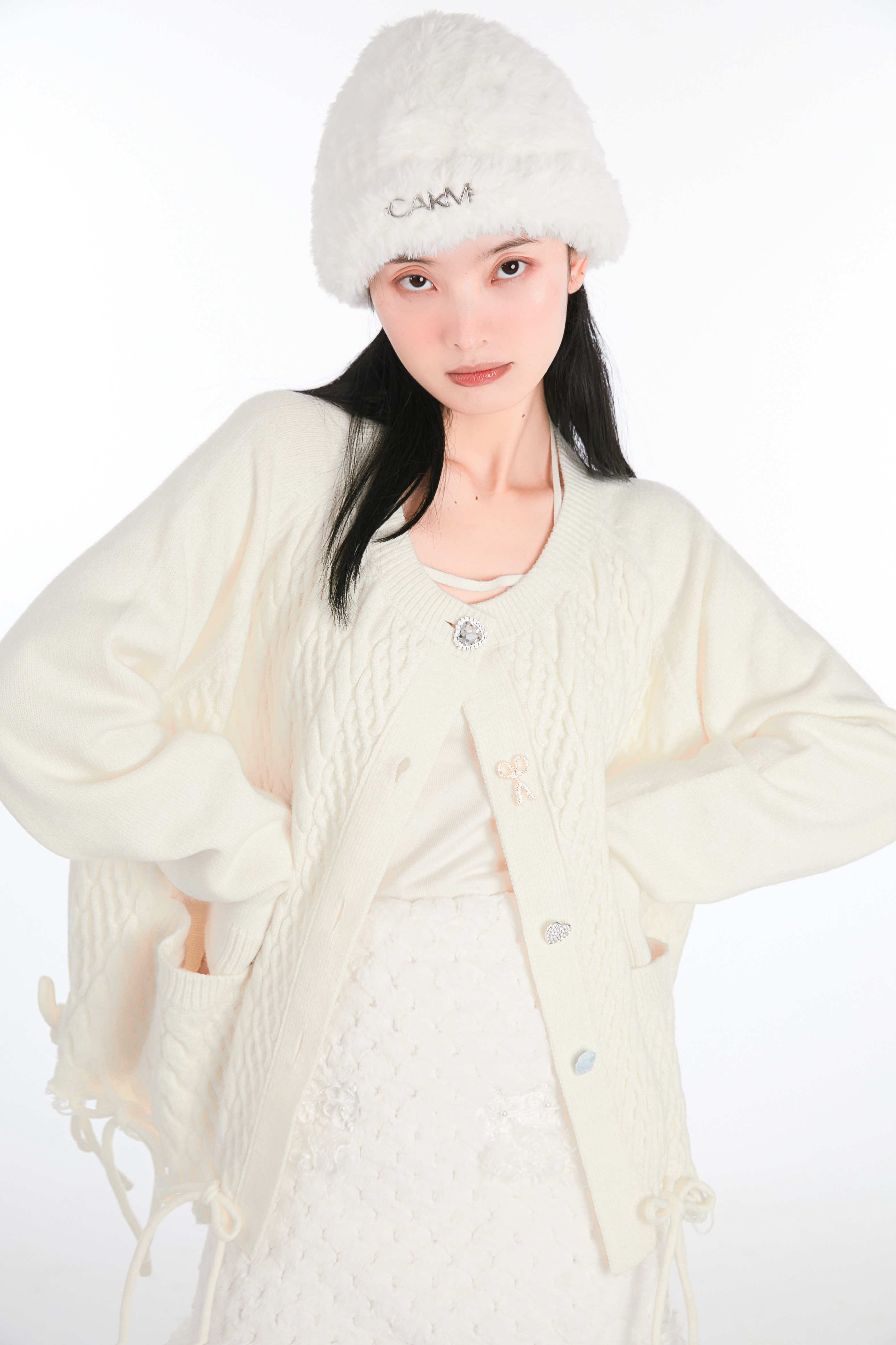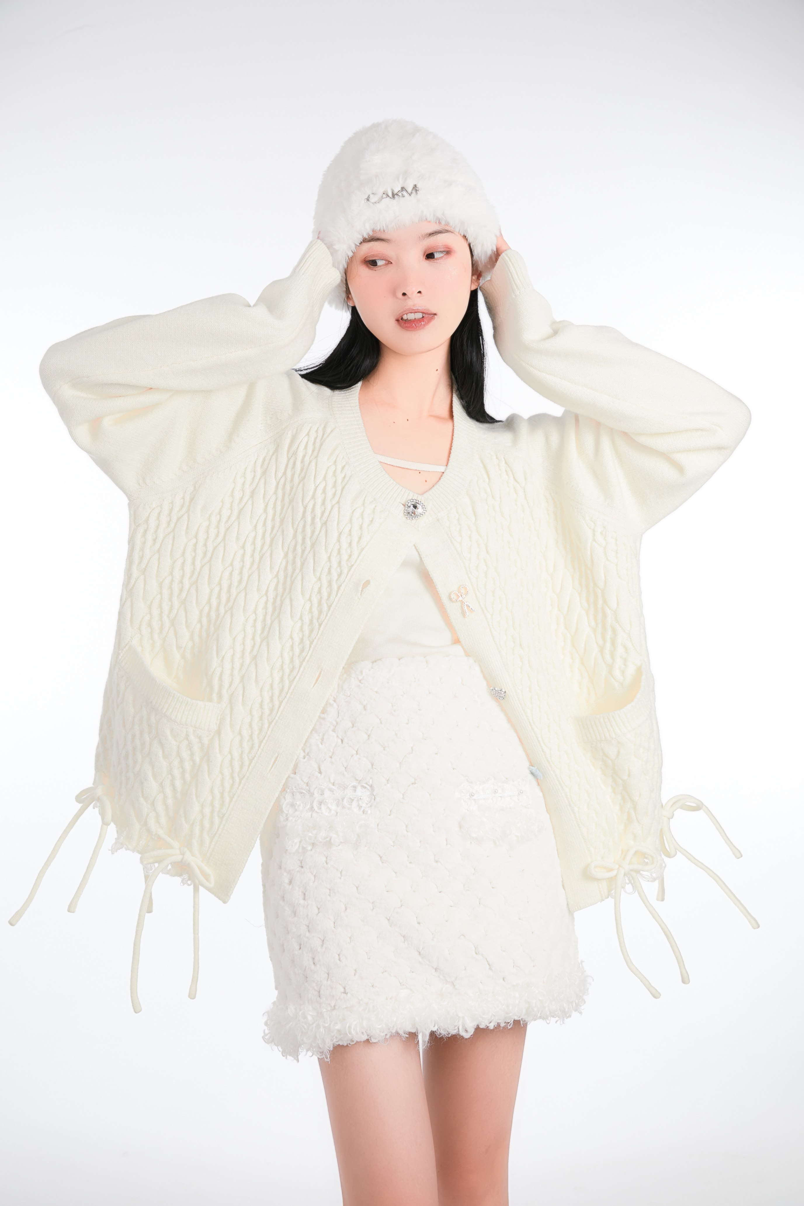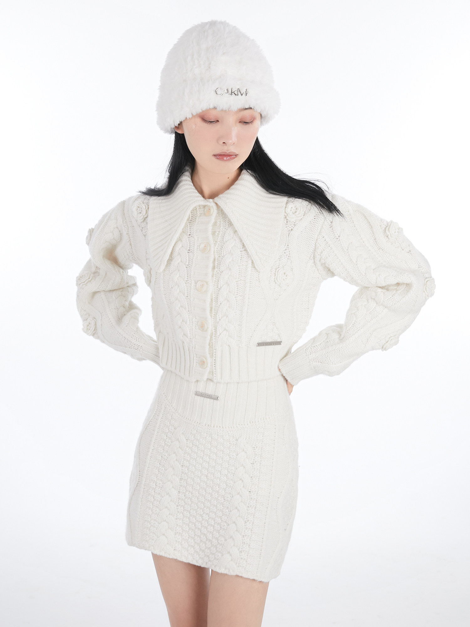 Кремовая зимняя белая трикотажная утепленная вязаная шапка, коллекция 2021