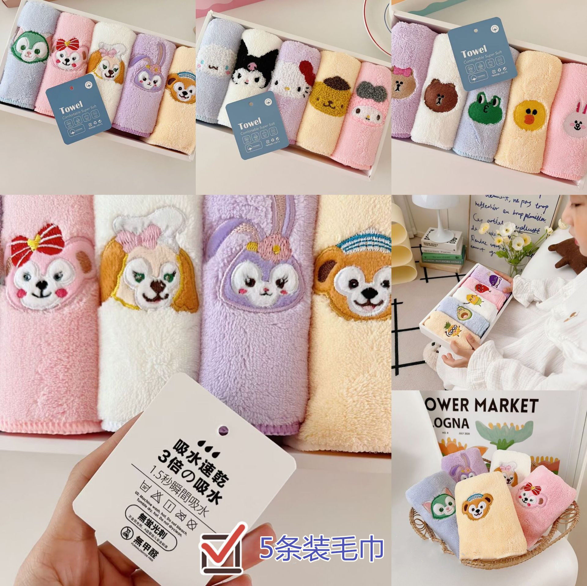 Детские мультяшные влажные салфетки для умывания, коралловое бархатное быстросохнущее полотенце, подарочная коробка, 5 шт, с вышивкой, хорошо впитывает воду