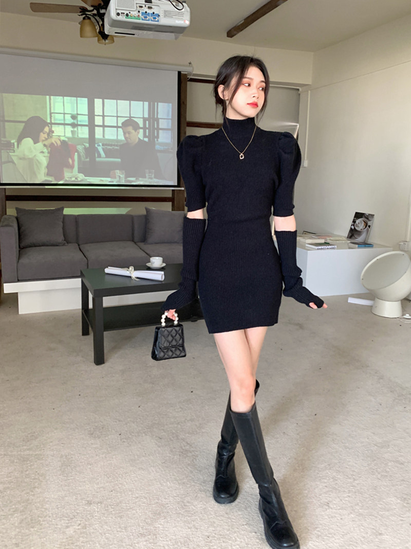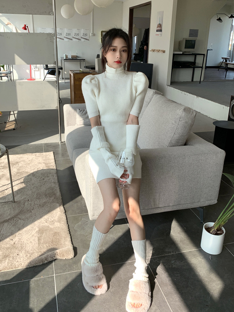 Дизайнерское белое зимнее трикотажное платье, базовое шерстяное платье, тренд сезона, облегающий крой, рукава фонарики