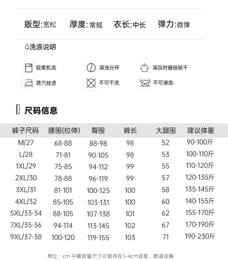 | Размер: | 1xl/29 (рекомендуется 110-120 кот), 2xl/30 (рекомендуется 120-135 Catties), 3xl/31 (рекомендуется 135-145 Catties), 4xl/32 (предложение 140-155 Catties), 5xl/33-34 (рекомендуется 155-170 Catties), 7xl/35-36 (рекомендовано 170-190 кот), 9xl/37-38 (рекомендуется 190-230 Catties) |