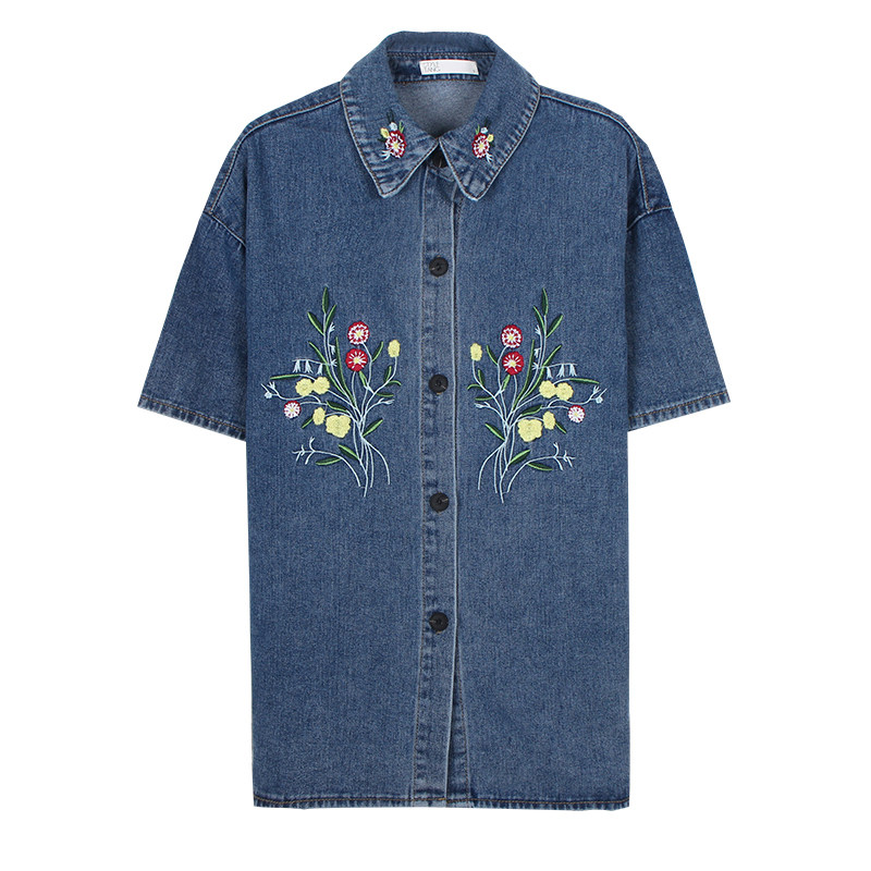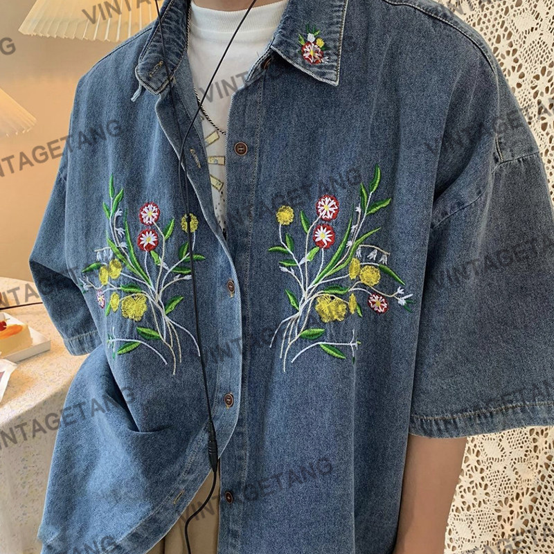 Ретро синяя летняя рубашка, в американском стиле, с вышивкой, короткий рукав