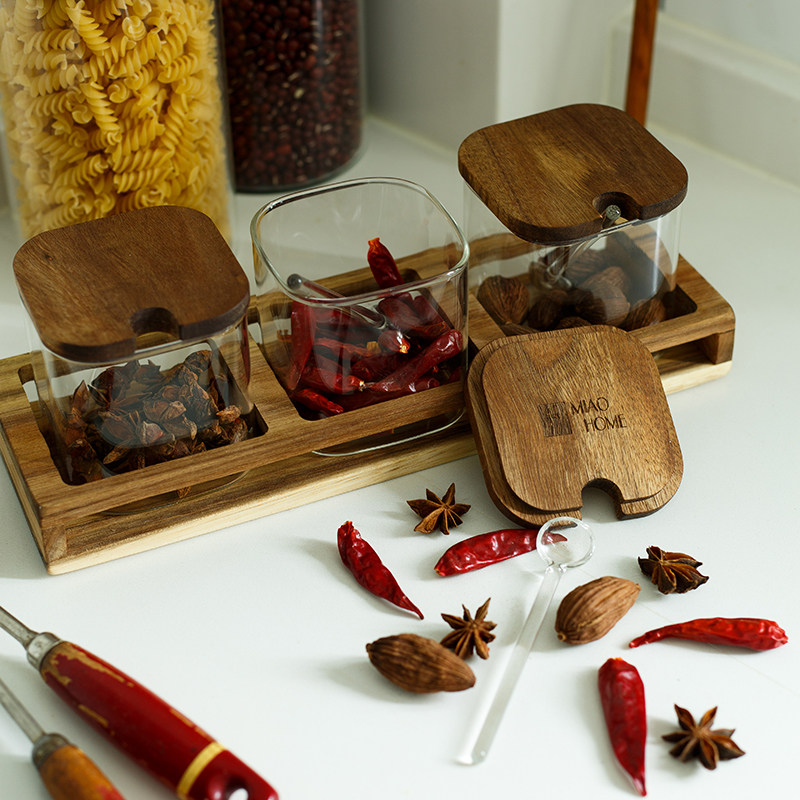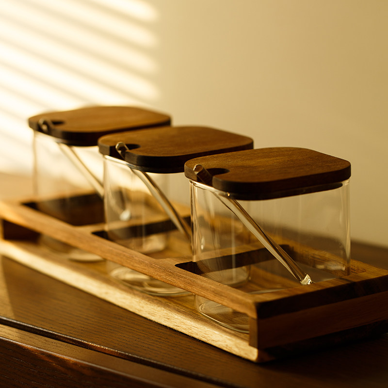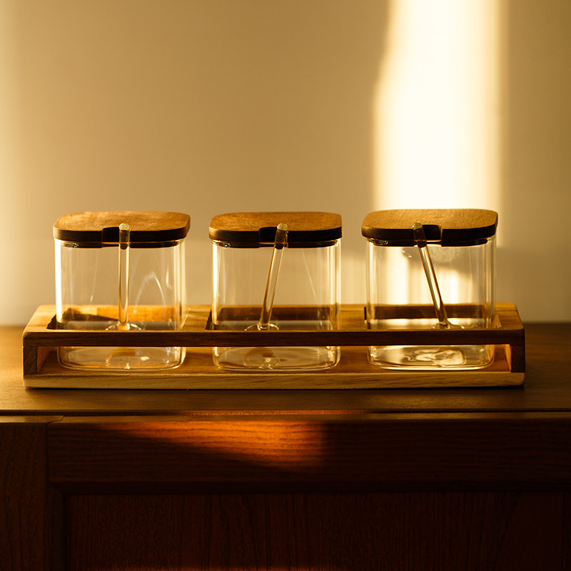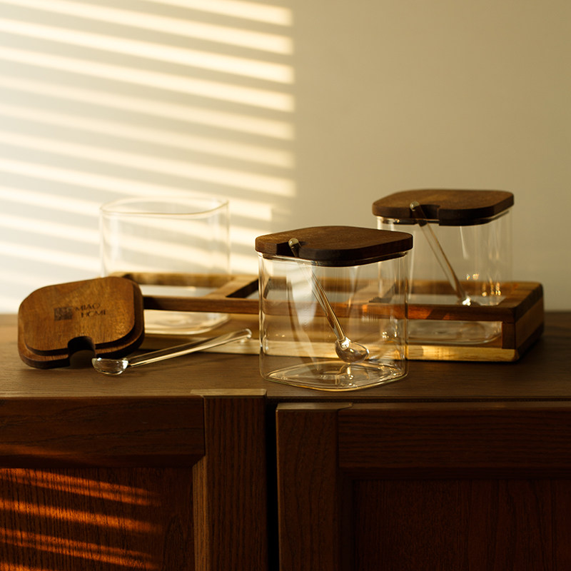妙HOME Японская стиль акациа -хаус кухонный приправочный резервуар с соленой сахарной банкой с ложкой с ложкой с ложкой