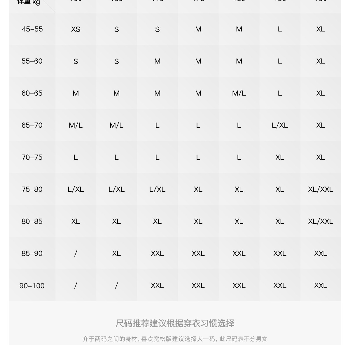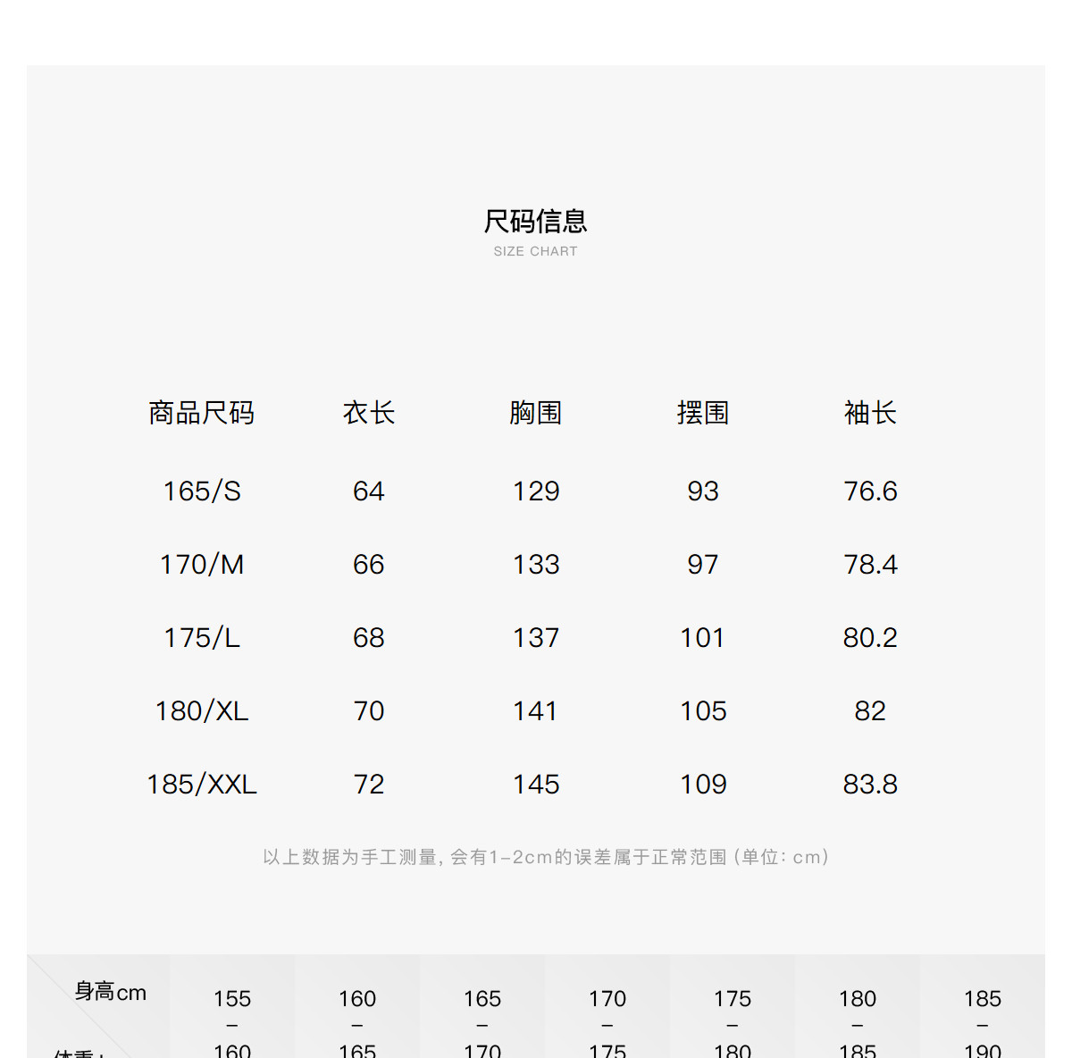 - = 185/XXL 175/L 180/XL