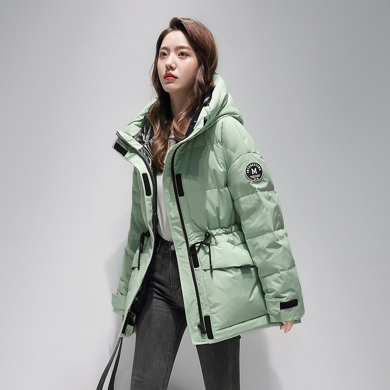 Демисезонный удерживающий тепло дизайнерский ветрозащитный модный пуховик с капюшоном, на шнурках