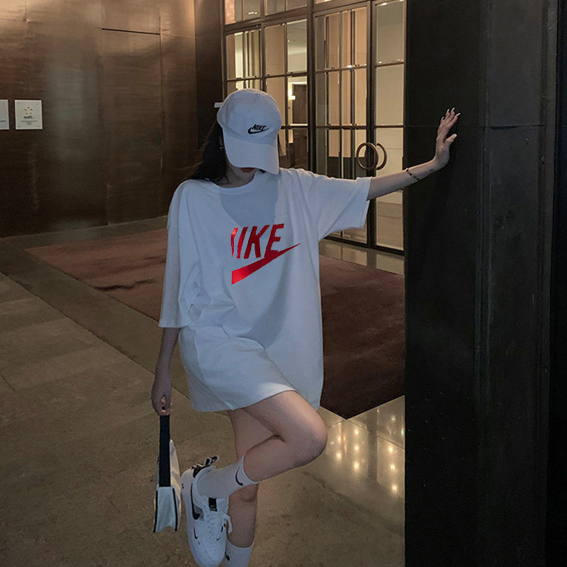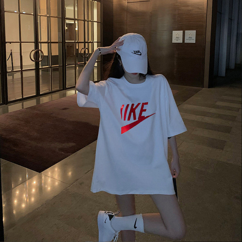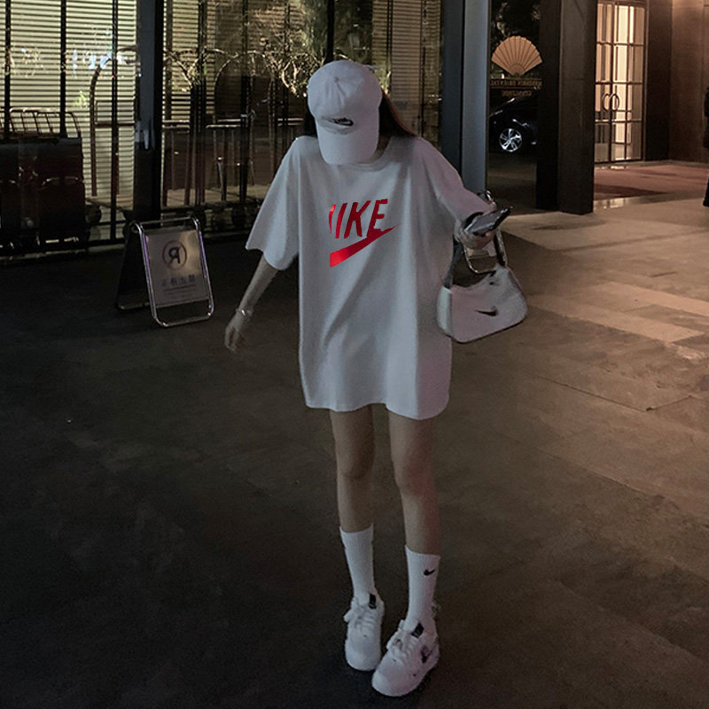 Белая летняя длинная хлопковая футболка с коротким рукавом, свободный крой, средней длины, короткий рукав