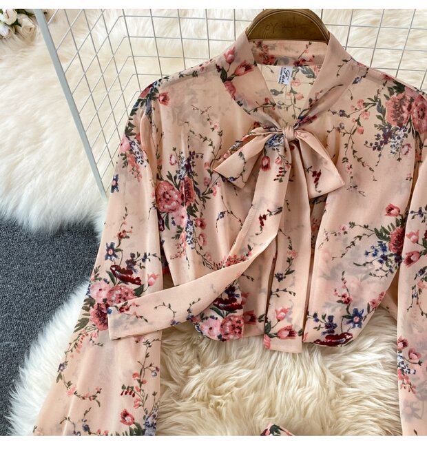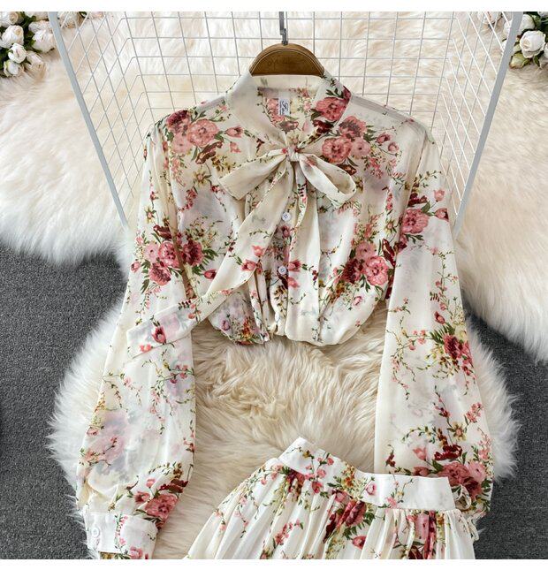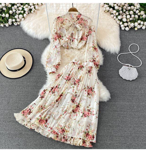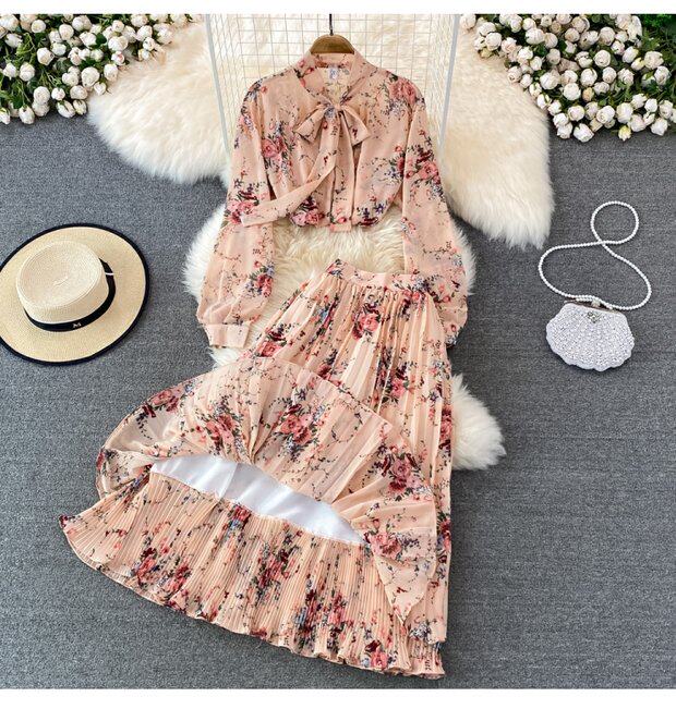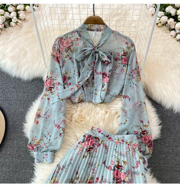 Комплект с бантиком, шифоновая юбка в складку, свободный крой, высокая талия