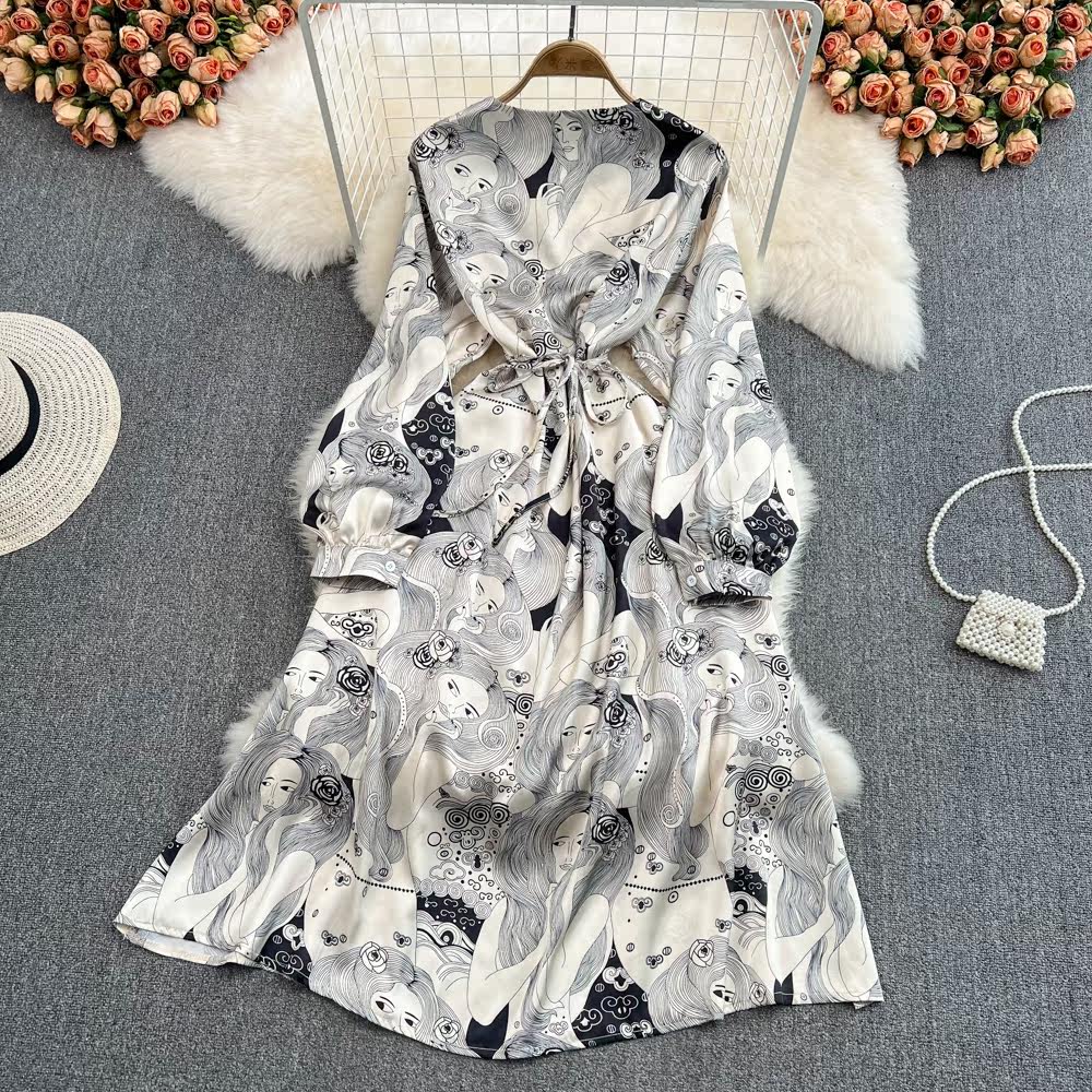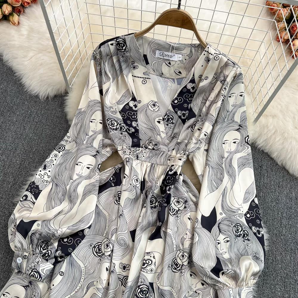 Весенний ретро лонгслив, приталенное элегантное платье, длинная юбка, французский стиль, V-образный вырез, высокая талия, А-силуэт