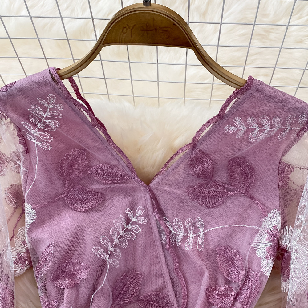 Лонгслив, длинная юбка, французский стиль, V-образный вырез, с вышивкой, А-силуэт